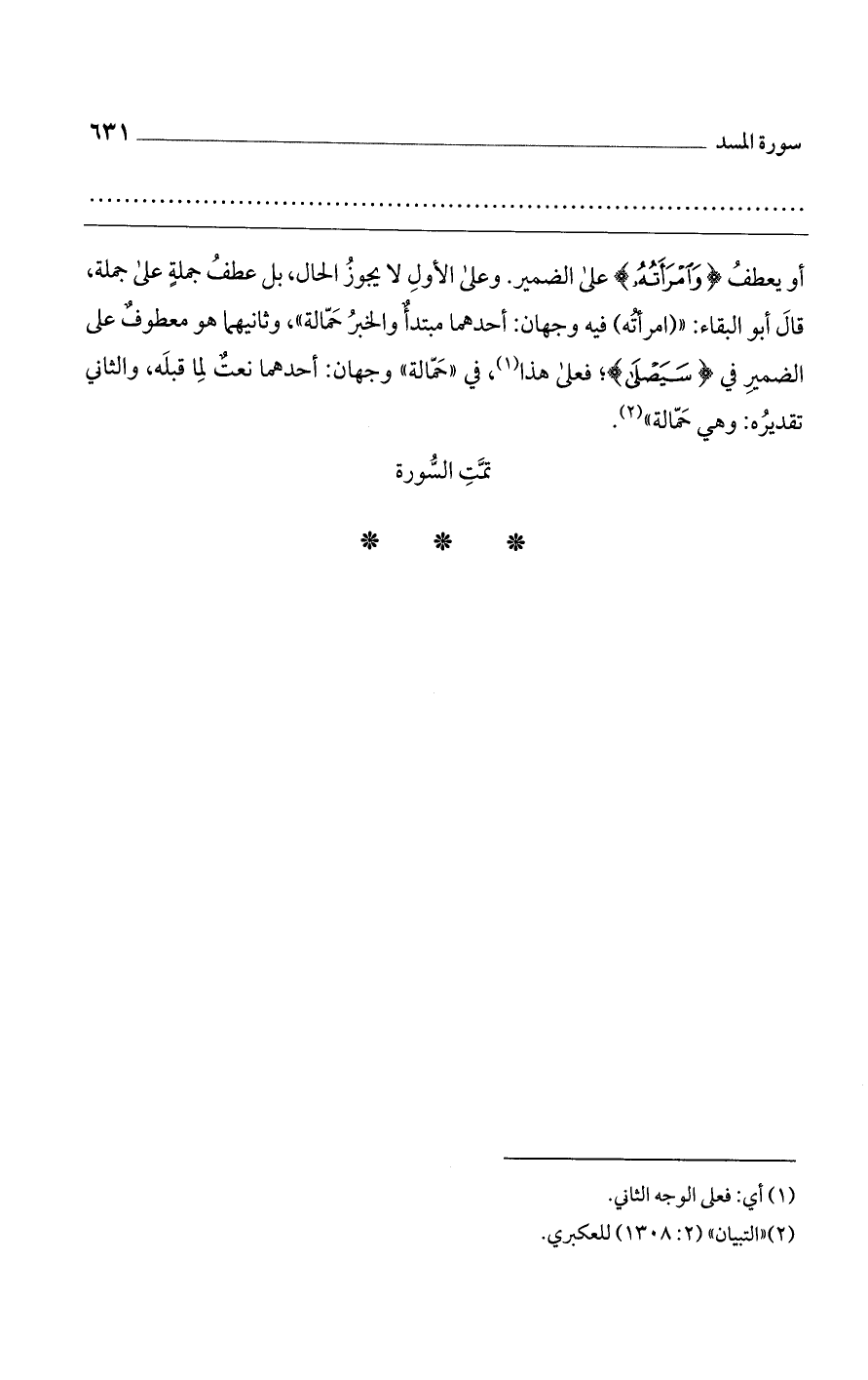 أو يعطفُ {وَامْرَأَتُهُ} على الضمير. وعلى الأولِ لا يجوزُ الحال، بل عطفُ جملةٍ على جملة، قالَ أبو البقاء: «(امرأتُه) فيه وجهان: أحدهما مبتدأٌ والخبرُ حَمّالة"، وثانيهما هو معطوفٌ على الضمير في {سَيَصْلَى}؛ فعلى هذا، في "حَمّالة" وجهان: أحدهما نعتٌ لِما قبلَه، والثاني تقديرُه: وهي حَمّالة».