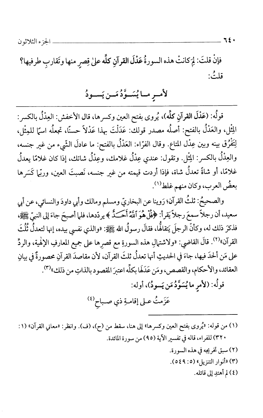 والصحيحُ: ثلثُ القرآن؛ رَوينا عن البخاريّ ومسلم ومالك وأبي داودَ والنسائي، عن أبي سعيد، أن رجلًا سمعَ رجلًا يقرأ: {قُلْ هُوَ اللَّهُ أَحَدٌ} يردّدها، فلما أصبحَ جاءَ إلى النبيّ -صلى الله عليه وسلم-، فذكرَ ذلك له، وكأنّ الرجلَ يتَقألُّها، فقال رسول الله -صلى الله عليه وسلم-: «والذي نفسي بيده، إنها لتعدلُ ثُلُثَ القرآن». قال القاضي: «ولاشتمال هذه السورة مع قِصرِها على جميع المعارفِ الإلهية، والردِّ على مَن ألحدَ فيها، جاء في الحديثِ أنها تعدلُ ثلثَ القرآن، لأن مقاصدِ القرآنِ محصورةٌ في بيانِ العقائد، والأحكام، والقضض، ومَن عَدَلَها بكلِّه اعتبرَ المقصودِ بالذاتِ من ذلك».
