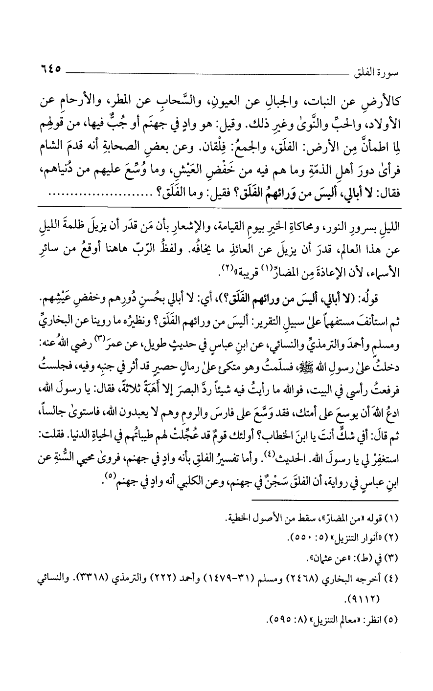 قولُه: (لا أبالي، أليسَ من ورائهم الفَلَق؟ )، أي: لا أبالي بحُسنِ دُورِهم وخفضِ عَيْشِهم. ثم استأنفَ مستفهمًا على سبيل التقرير: أليسَ من ورائهم الفَلَق؟ ونظيرُه ما روينا البخاريِّ ومسلمٍ وأحمدَ والترمذيِّ والنسائي، عن ابنِ عباسٍ في حديثٍ طويل، عن عمرَ -رضي الله عنه-: دخلتُ على رسول الله -صلى الله عليه وسلم-، فسلّمتُ وهو متكئ على رمالٍ حصيرٍ قد أثر في جنبِه وفه شيئًا ردَّيه، فجلستُ فرفعتُ رأسي في البيت، فوالله ما رأيتُ فيه شيئًا ردَّ البصرَ إلا أَهَبَةَّ ثلاثةً، فقال: يا رسولَ الله، ادع الله أن يوسعَ على أمتك، فقد وَسَّعَ على فارسَ والرومِ وهم لا يعبدون الله، فاستوى جالسًا، ثم قالَ: أفي شكٍّ أنت يا ابنَ الخطاب؟ أول~ك قومٌ قد عُجِّلتْ لهم طيباتُهم في الحياة الدنيا. فقلت: استغفِرْ لي يا رسولَ الله. الحديث. وأما تفسير الفلقِ بأنه وادٍ في جهنم، فروى محيي السُّنةِ عن ابن عباسٍ في رواية، أن الفلقَ سَجْنٌ في جهنم، وعن الكلبي أنه وادٍ في جهنم.