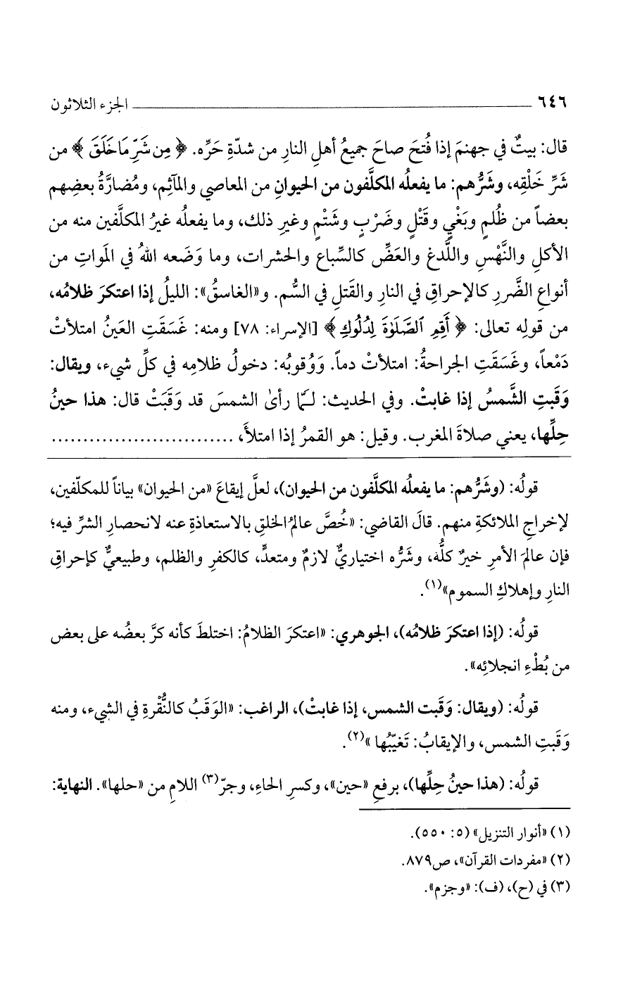 قال: بيت في جهنم إذا فتح صاح جميع أهل النار من شدّة حرّه. (مِنْ شَرِّ ما خَلَقَ) من شر خلقه، وشرهم: ما يفعله المكلفون من الحيوان من المعاصي والمآثم، ومضارّة بعضهم بعضًا من ظلم وبغى وقتل وضرب وشتم وغير ذلك، وما يفعله غير المكلفين منه عن الأكل والنهس واللدغ والعض كالسباع والحشرات، وما وضعه الله في الموات من أنواع الضرر كالإحراق في النار والقتل في السم. و"الغاسق": الليل إذا اعتكر ظلامه، من قوله تعالى: (أَقِمِ الصَّلاةَ لِدُلُوكِ)] الإسراء: 78 [ومنه: غسقت العين امتلأت دمعا، وغسقت الجراحة: امتلأت دمًا. ووقوبه: دخول ظلامه في كل شيء، ويقال: وقبت الشمس إذا غابت. وفي الحديث: لما رأى الشمس قد وقبت قال: هذا حين حلها، يعنى صلاة المغرب. وقيل: هو القمر إذا امتلأ،