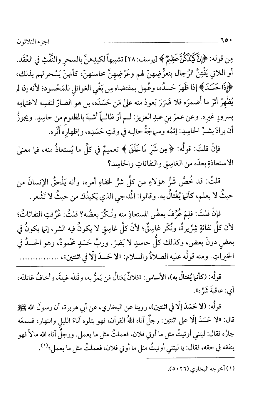 فإن قلت: فلم عرف بعض المستعاذ منه ونكر بعضه؟ قلت: عرفت النفاثات؛ لأن كل نفاثة شريرة، ونكر غاسق؛ لأنّ كل غاسق لا يكون فيه الشر، إنما يكون في بعض دون بعض، وكذلك كل حاسد لا يضرّ. ورب حسد محمود، وهو الحسد في الخيرات. ومنه قوله عليه الصلاة والسلام: «لا حسد إلا في اثنتين»،