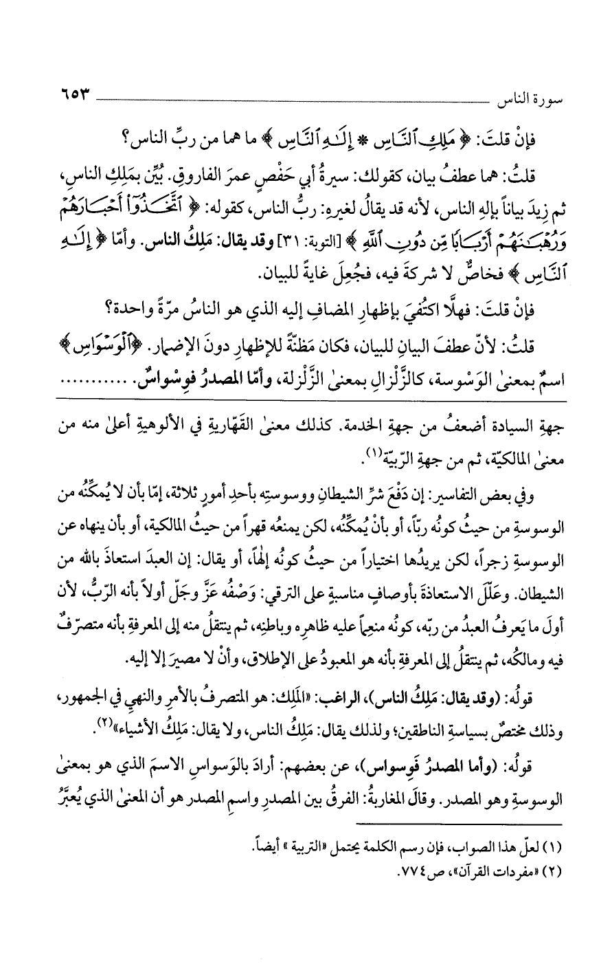 وفي بعض التفاسير: إنَّ دَفْعَ شرِّ الشيطانِ ووسوستِه بأحدِ أمورً ثلاثة، إمّا بأن لا يُمكِّنُه من الوسوسةِ من حيثُ كونُه ربًّا، أو بأنْ يُمكِّنُه، لكن يمنعُه قهرًا من حيثُ المالكية، أو بأن ينهاه عن الوسوسةِ زجرًا، لكن يريدُها اختيارًا من حيثُ كونُه إلهًا، أو يُقال: إن العبدَ استعاذَ بالله من الشيطان. وعَلّلَ الاستعاذةَ بأوصافٍ مناسبةٍ على الترقي: وَصْفُه عَزَّ وجَلّ أولًا بأنه الرّبُّ، لأن أول ما يَعرفُ العبدُ من ربِّه، كونُه منعِمًا عليه ظاهرِه وباطنِه، ثم ينتقلُ منه إلى المعرفةِ بأنه متصرفٌ فيه ومالكُه، ثم ينتقلُ إلى المعرفةِ بأنه هو المعبودُ على الإطلاق، وأنْ لا مصيرَ إلا إليه.