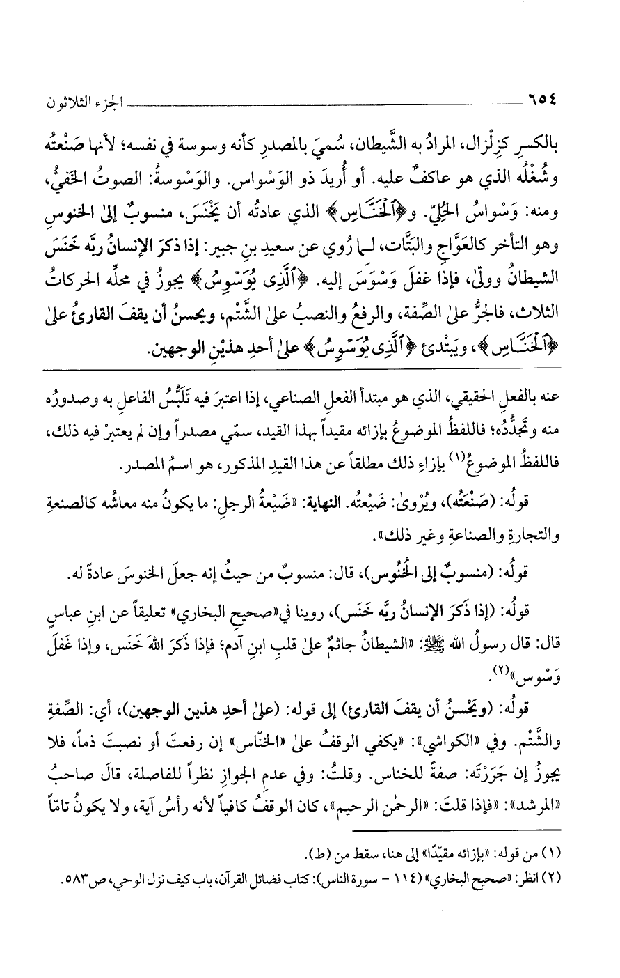 قولُه: (ويَحْسنُ أن يقف القارئ) إلى قولُه: (على أحدِ هذين الوجهين)، أي: الصَّفةِ والشَّتْم. وفيي "الكواشي": «يكفي الوقفُ على "الخنّاس" إن رفعتَ أو نصبتَ ذمًا، فلا يجوزُ إن جَرَرْتَه: صفةٌ للخناس. وقلتُ: وفي عدمِ الجوازِ نظرًا للفاصلة، قالَ صاحبُ "المرشد": فإذا قلتَ: "الرحمن الرحيم"، كان الوقفُ كافيًا لأنه رأسُ آية، ولا يكونُ تامًا