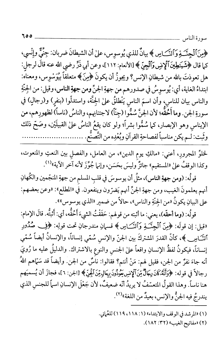 قولُه: (وما أحقّه)، يعني: ما أثبته من قولهم: حَقَقْتُ الشئَ أَحُقُّه، أي: أَثبتُه. قال الإمام: «قيل: إن قولَه: {مِنَ الْجِنَّةِ وَالنَّاسِ} قسمان مندرجان تحت قولِه: {فِي صُدُورِ النَّاسِ}، كأن القدرَ المشتركَ بين الجنِّ والإنسِ سُمّي إنسانًا، والإنسانُ أيضًا سُمّي إنسانًا، فيكون لفظُ الإنسانِ واقعًا على الجنسِ والنوعِ بالاشتراك. والدليلُ عليه ما رُويَ أنه جاءَ نفرٌ من الجن، فقيل لهم: مَنْ أنتم؟ فقالوا: ناسٌ من الجن. وأيضًا قد سَمّاهم اللهُ رجالًا في قوله: {وَأَنَّهُ كَانَ رِجَالٌ مِنَ الْإِنْسِ يَعُوذُونَ بِرِجَالٍ مِنَ الْجِنِّ فَزَادُوهُمْ رَهَقًا} [الجن: 6]، فجازَ أن يُسميَهم هنا ناسًا. وهذا القولُث المتعسِّفُ لا يريدُ أنَه ضعيفٌ، لأن جَعْلَ الإنسانِ اسمًا للجنسِ الذي يندرجُ فيه الجنُّ والإنس، بعيدٌ من اللغة».