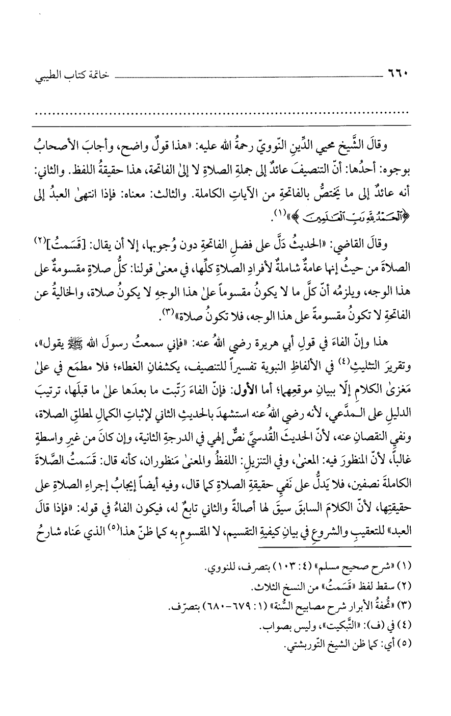 وقالَ الشَّيخ محيي الدِّينِ النّوويّ رحمهُ الله عليه: «هذا قولٌ واضح، وأجابَ الأصحابُ بوجوه: أحدُها: أنّ التصنيفَ عائدٌ إلى جملةِ الصلاةِ لا إلى الفاتحة، هذا حقيقةُ اللفظ. والثاني: أنه عائدٌ إلى ما يختصُّ بالفتحةِ من الآياتِ الكاملة. والثالث: معناه: فإذا انتهى العبدُ إلى {الْحَمْدُ لِلَّهِ رَبِّ الْعَالَمِينَ}».