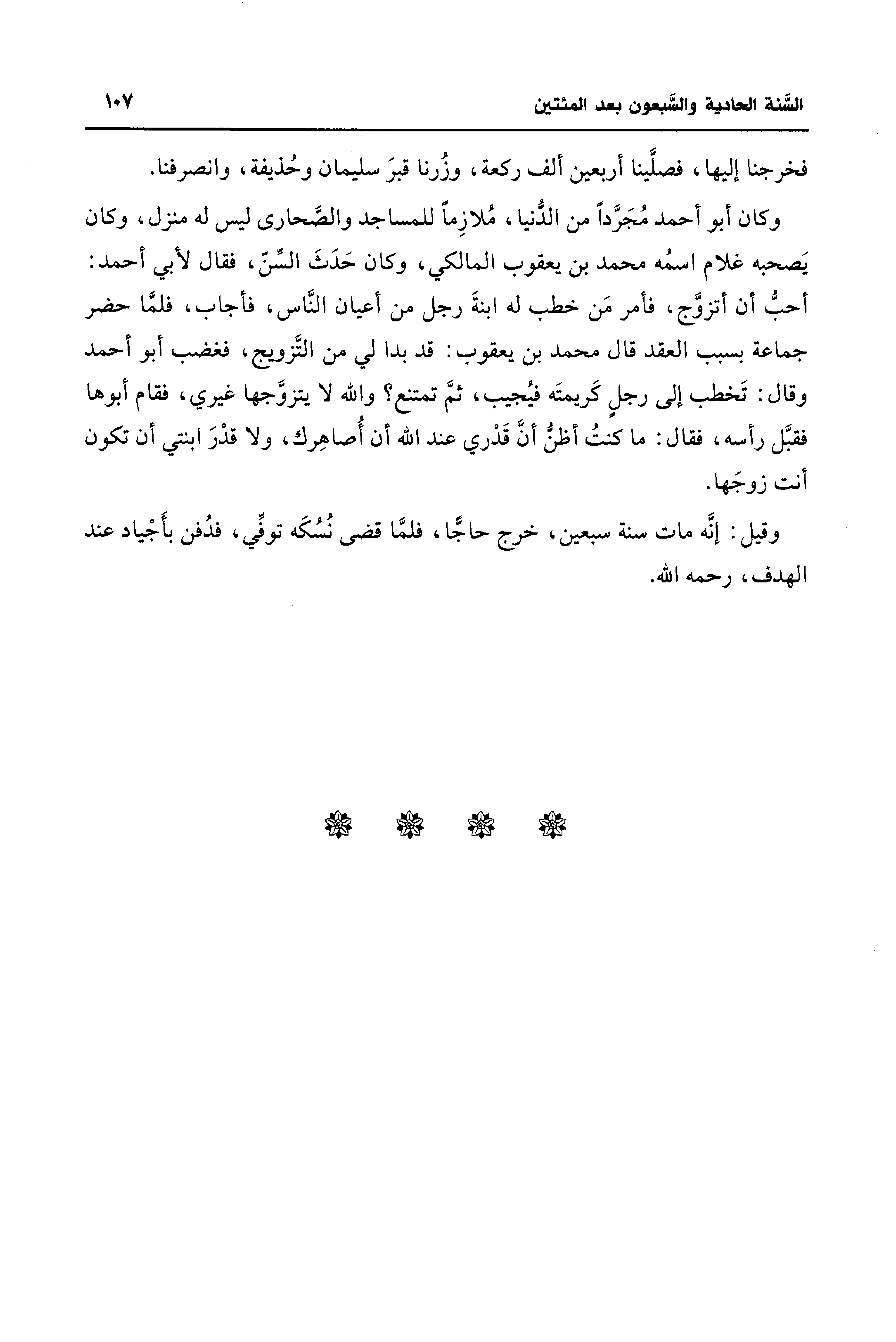 وكان أبو أحمد مُجَرَّدًا من الدُّنيا، مُلازِمًا للمساجد والصَّحارى ليس له منزل، وكان يَصحبه غلام اسمُه محمد بن يعقوب المالكي، وكان حَدَثَ السِّنّ، فقال لأبي أحمد: أحبُّ أن أتزوَّج، فأمر مَن خطب له ابنةَ رجل من أعيان النَّاس، فأجاب، فلمَّا حضر جماعة بسبب العقد قال محمد بن يعقوب: قد بدا لي من التَّزويج، فغضب أبو أحمد وقال: تَخطب إلى رجلٍ كَريمتَه فيُجيب، ثمَّ تمتنع؟ والله لا يتزوَّجها غيري، فقام أبوها فقبَّل رأسه، فقال: ما كنتُ أظنُّ أنَّ قَدْري عند الله أن أُصاهِرك، ولا قدْرَ ابنتي أن تكون أنت زوجَها.