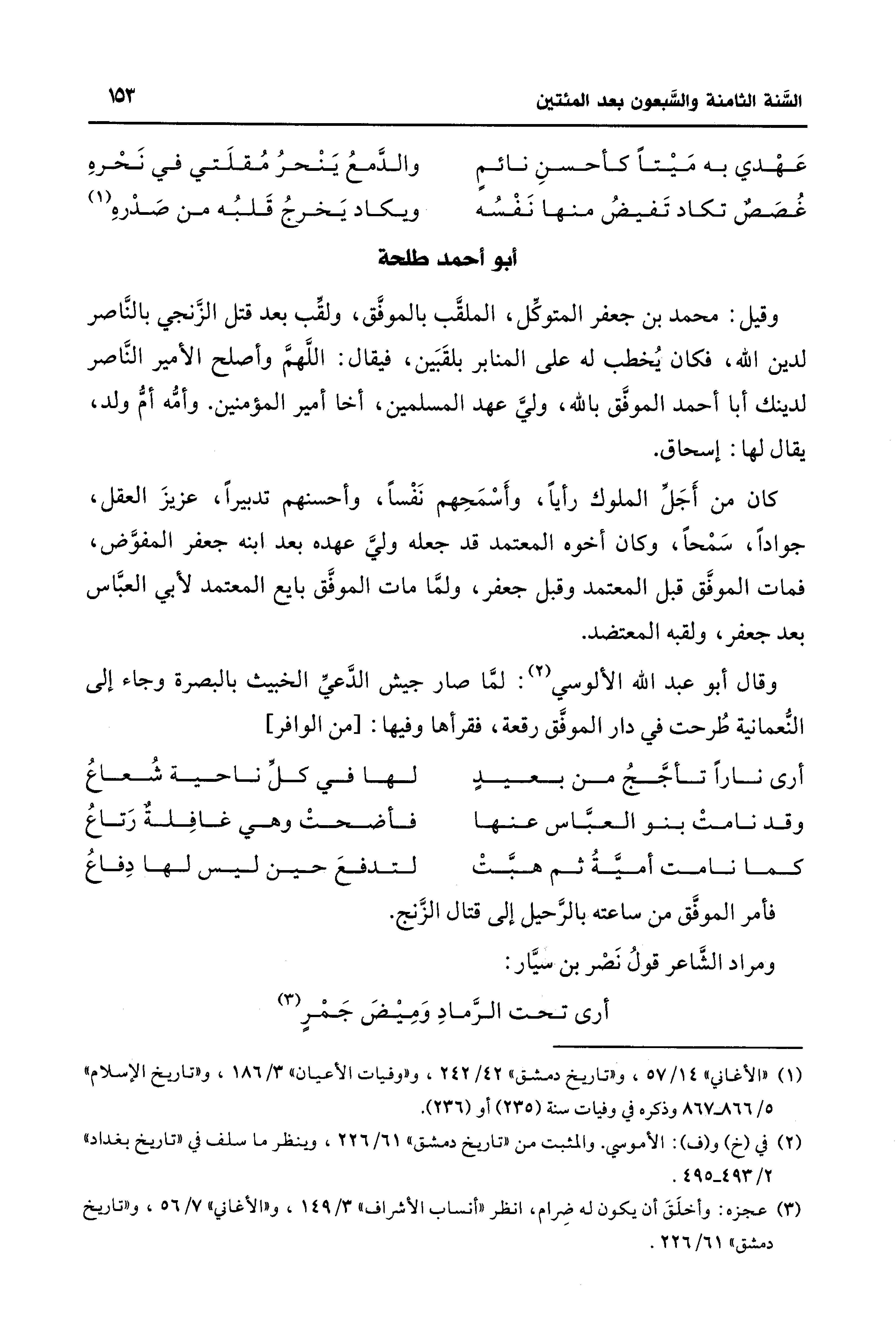 وقيل: محمد بن جعفر المتوكِّل، الملقَّب بالموفَّق، ولقِّب بعد قتل الزَّنجي بالنَّاصر لدين الله، فكان يُخطب له على المنابر بلقَبَين، فيقال: اللَّهمَّ وأصلح الأمير النَّاصر لدينك أبا أحمد الموفَّق بالله، وليَّ عهد المسلمين، أخا أمير المؤمنين. وأمُّه أمُّ ولد، يقال لها: إسحاق.