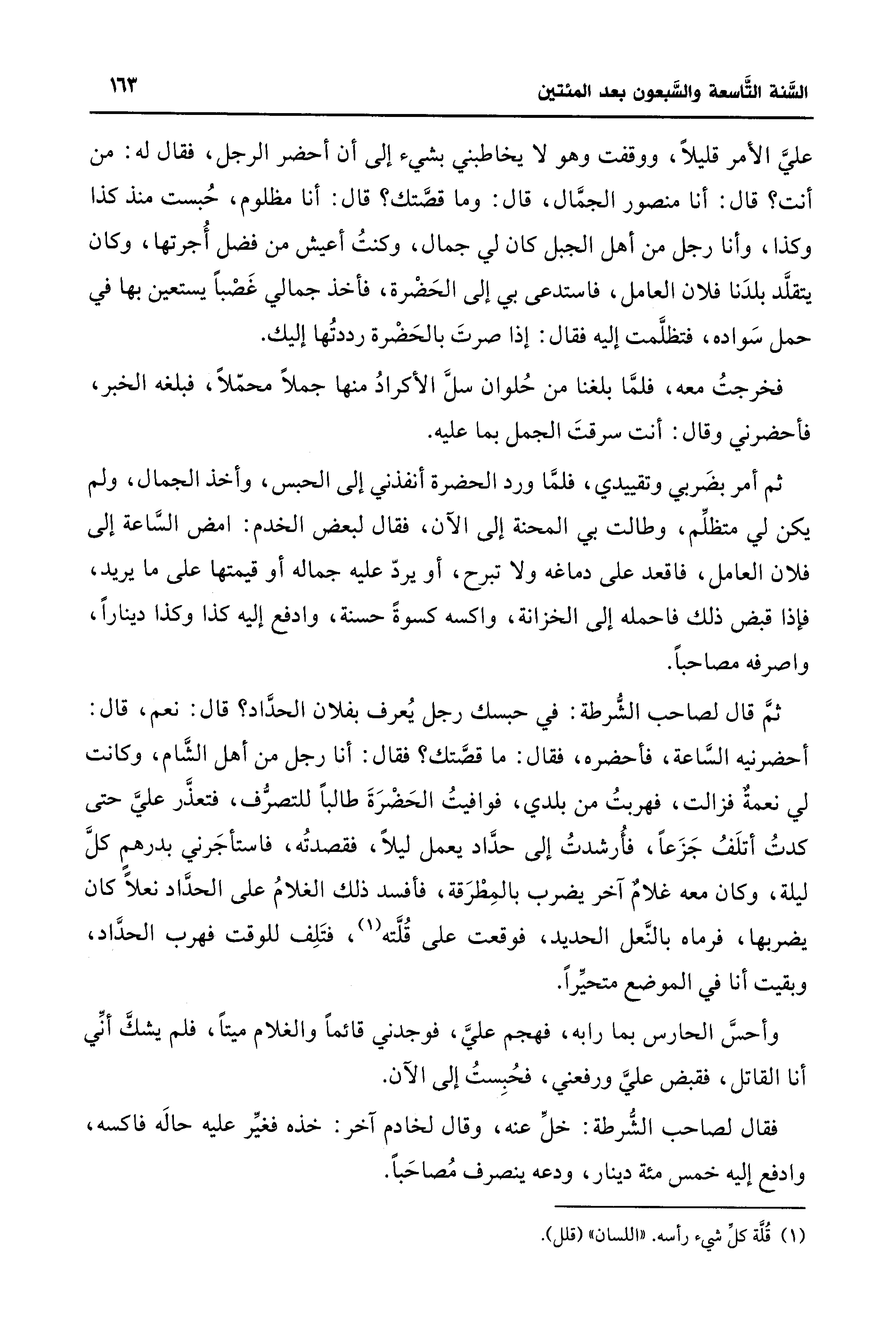 ثم أمر بضَربي وتقييدي، فلمَّا ورد الحضرة أنفذني إلى الحبس، وأخذ الجمال، ولم يكن لي متظلِّم، وطالت بي المحنة إلى الآن، فقال لبعض الخدم: امض السَّاعة إلى فلان العامل، فاقعد على دماغه ولا تبرح، أو يردّ عليه جماله أو قيمتها على ما يريد، فإذا قبض ذلك فاحمله إلى الخزانة، واكسه كسوةً حسنة، وادفع إليه كذا وكذا دينارًا، واصرفه مصاحبًا.