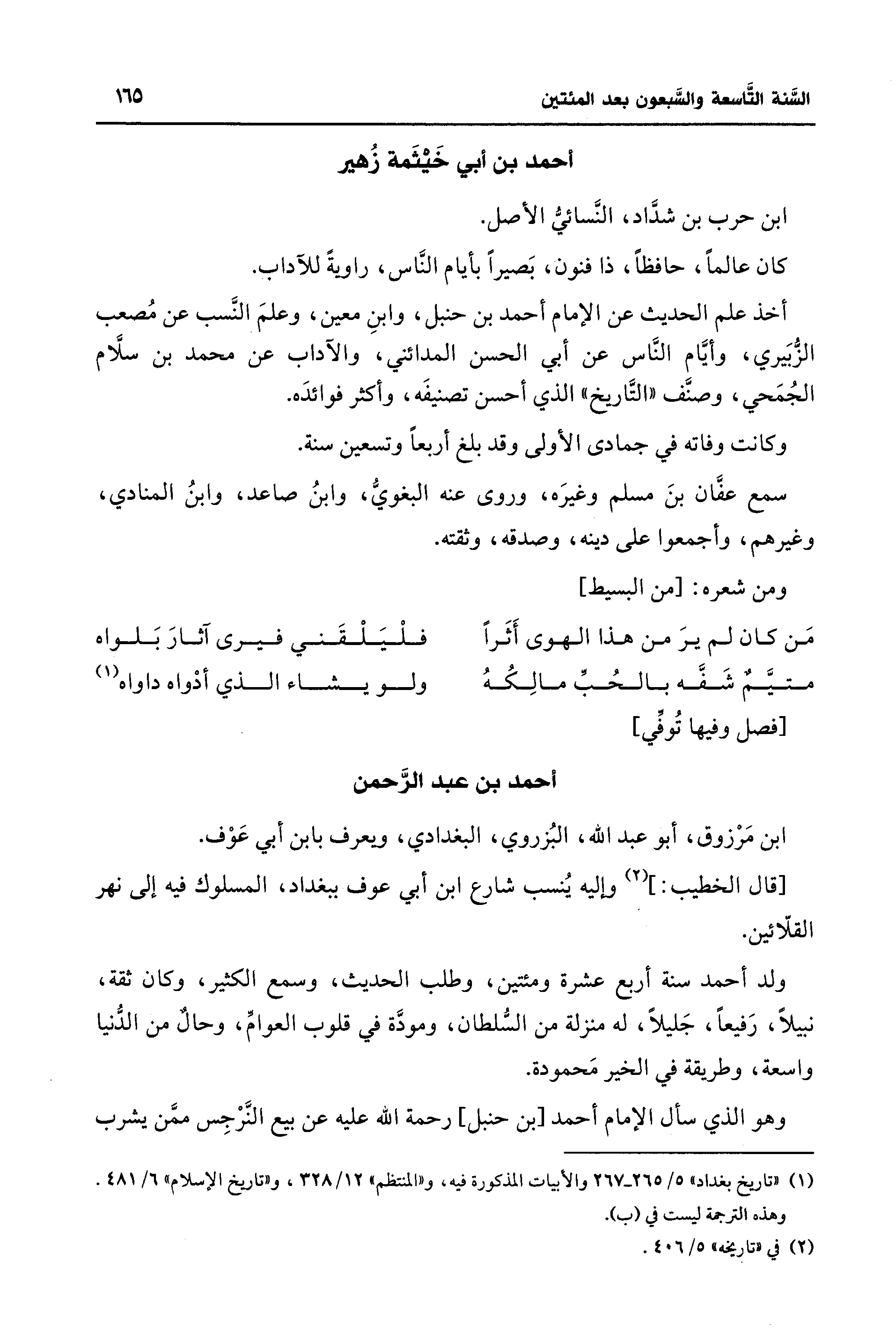 (¬1) "تاريخ بغداد"5/ 265 - 267 والأبيات المذكورة فيه، و"المنتظم" 12/ 328، و "تاريخ الإسلام" 6/ 481. وهذه الترجمة ليست في (ب).