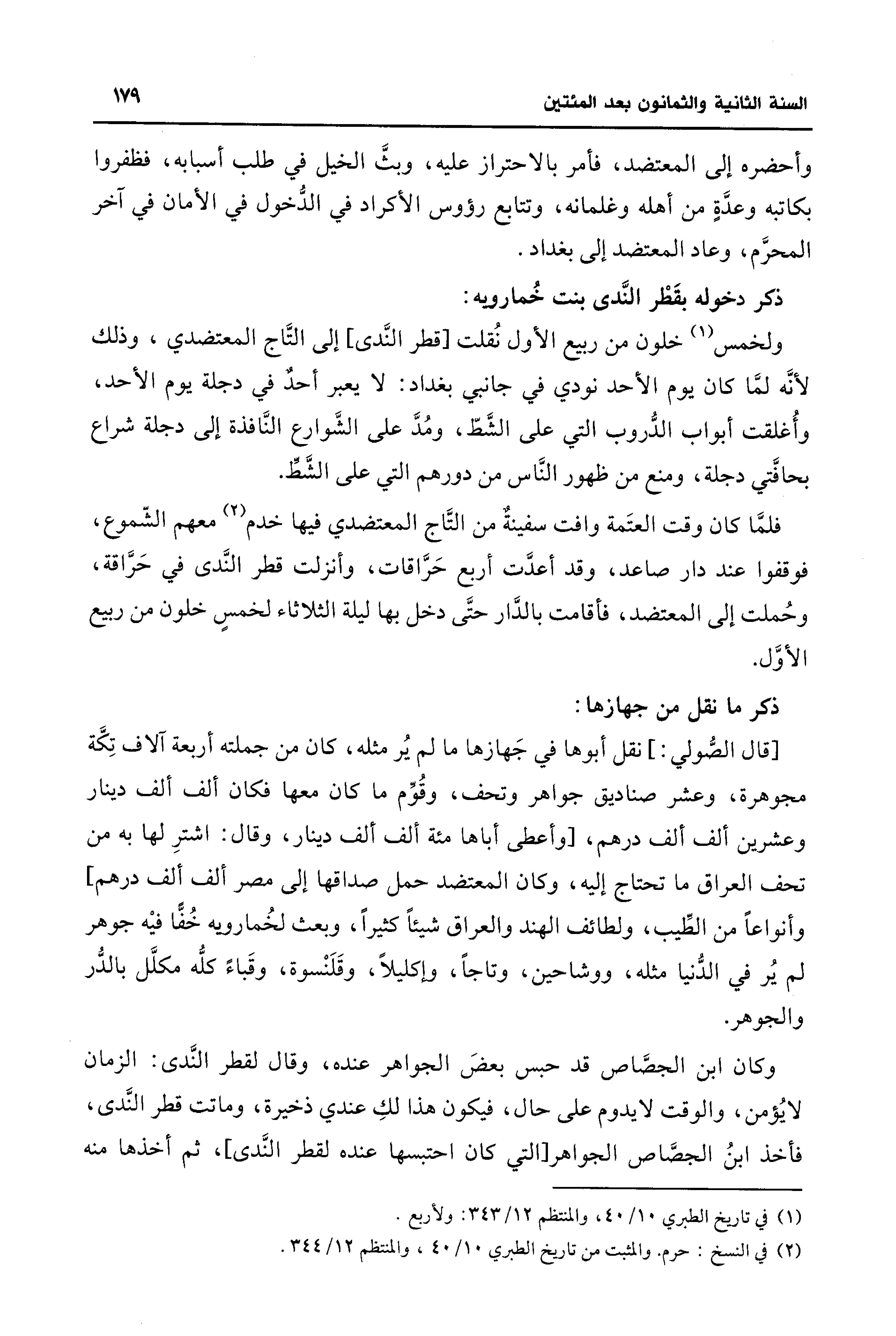 فلمَّا كان وقت العتَمة وافت سفينةٌ من التَّاج المعتضدي فيها خدم (¬2) معهم الشُّموع، فوقفوا عند دار صاعد، وقد أعدَّت أربع حَرَّاقات، وأنزلت قطر النَّدى في حَرَّاقة، وحُملت إلى المعتضد، فأقامت بالدَّار حتَّى دخل بها ليلة الثلاثاء لخمسٍ خلون من ربيع الأوَّل.