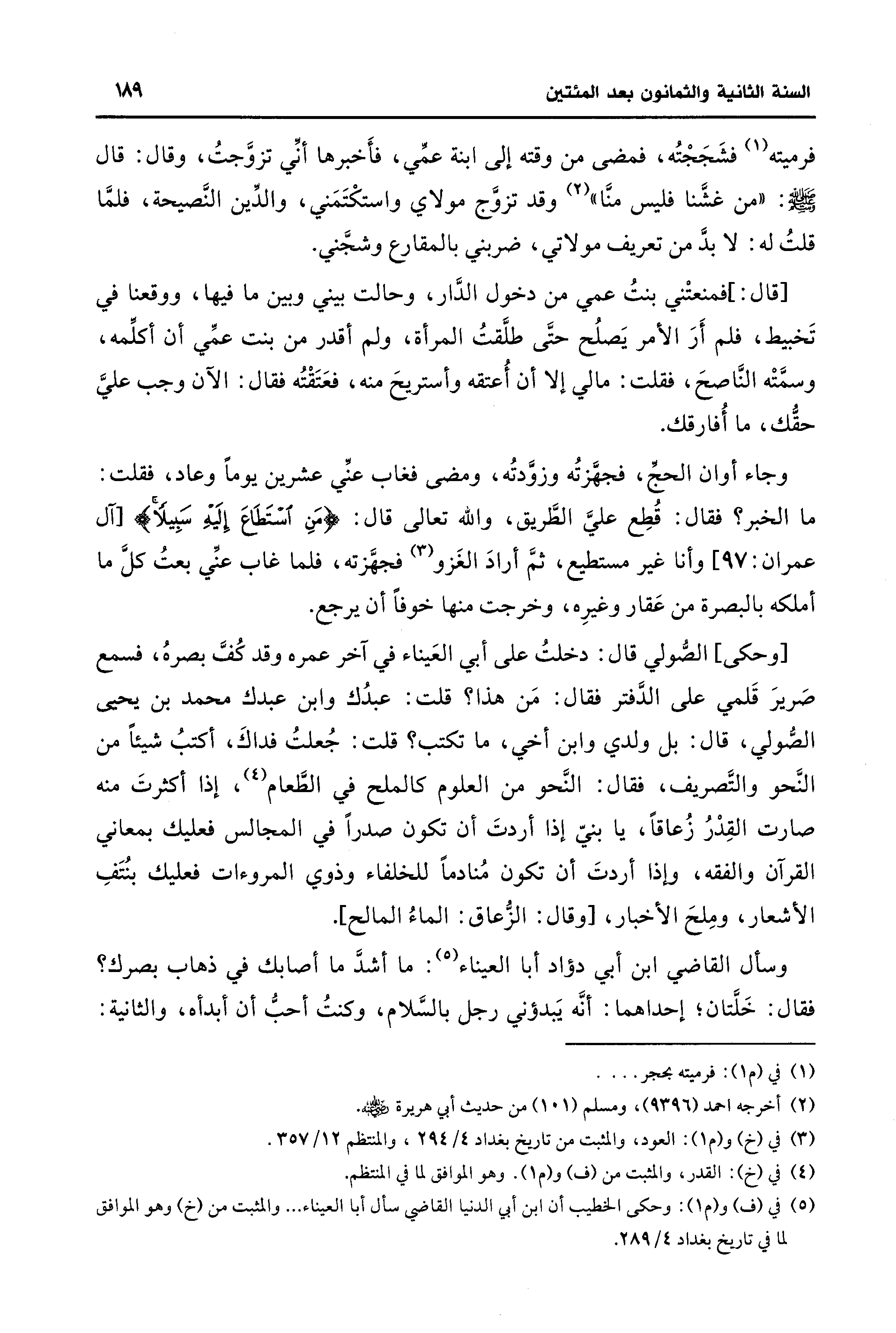 [قال: ] فمنعتْني بنتُ عمي من دخول الدَّار، وحالت بيني وبين ما فيها، ووقعنا في تَخبيط، فلم أَرَ الأمر يَصلُح حتَّى طلَّقتُ المرأة، ولم أقدر من بنت عمِّي أن أكلِّمه، وسمَّتْه النَّاصحَ، فقلت: ما لي إلا أن أُعتقه وأستريحَ منه، فعَتَقْتُه فقال: الآن وجب عليَّ حقُّك، ما أُفارقك.