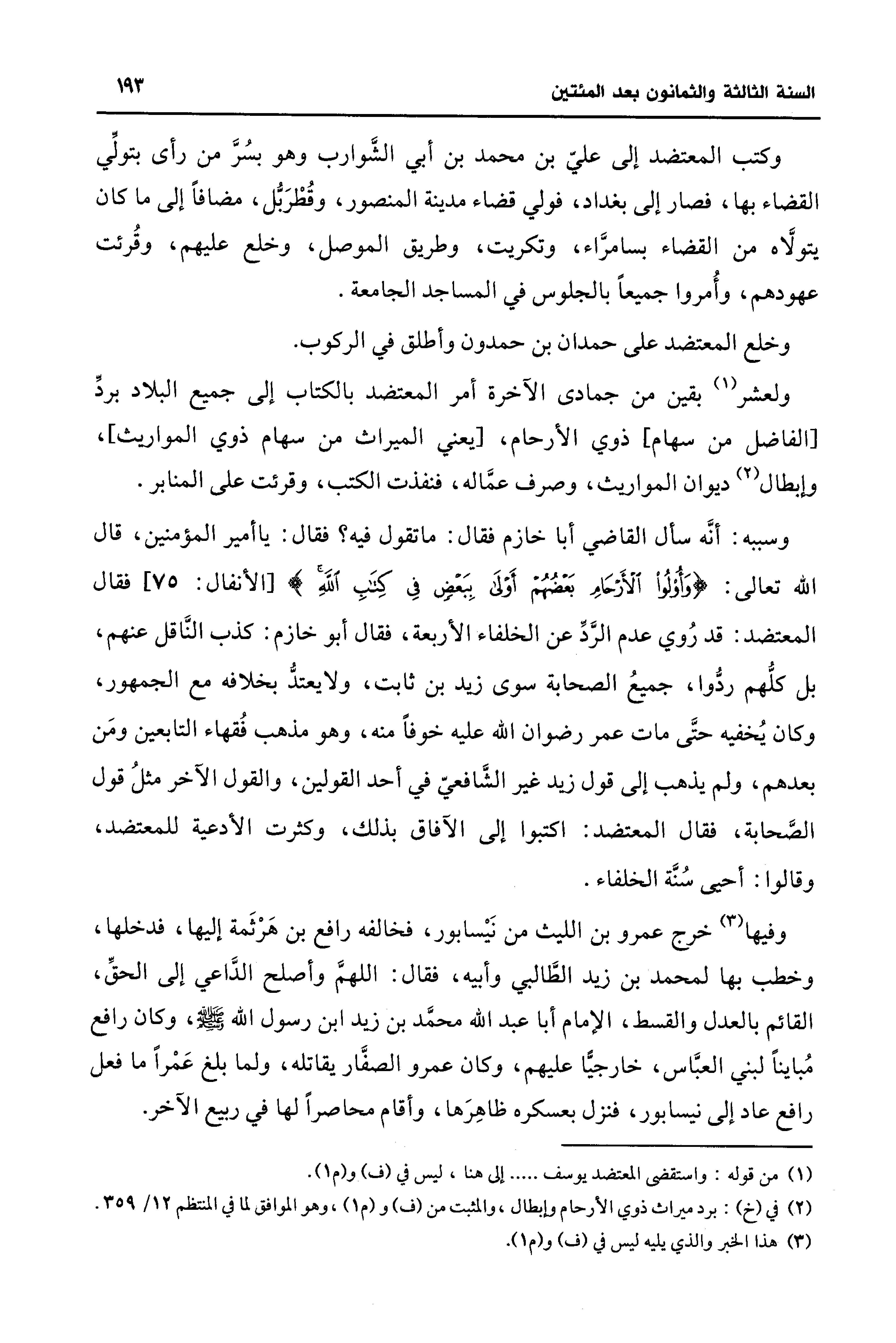 ولعشر (¬1) بقين من جمادى الآخرة أمر المعتضد بالكتاب إلى جميع البلاد بردِّ [الفاضل من سهام] ذوي الأرحام، [يعني الميراث من سهام ذوي المواريث]، وإبطال (¬2) ديوان المواريث، وصرف عمَّاله، فنفذت الكتب، وقرئت على المنابر.