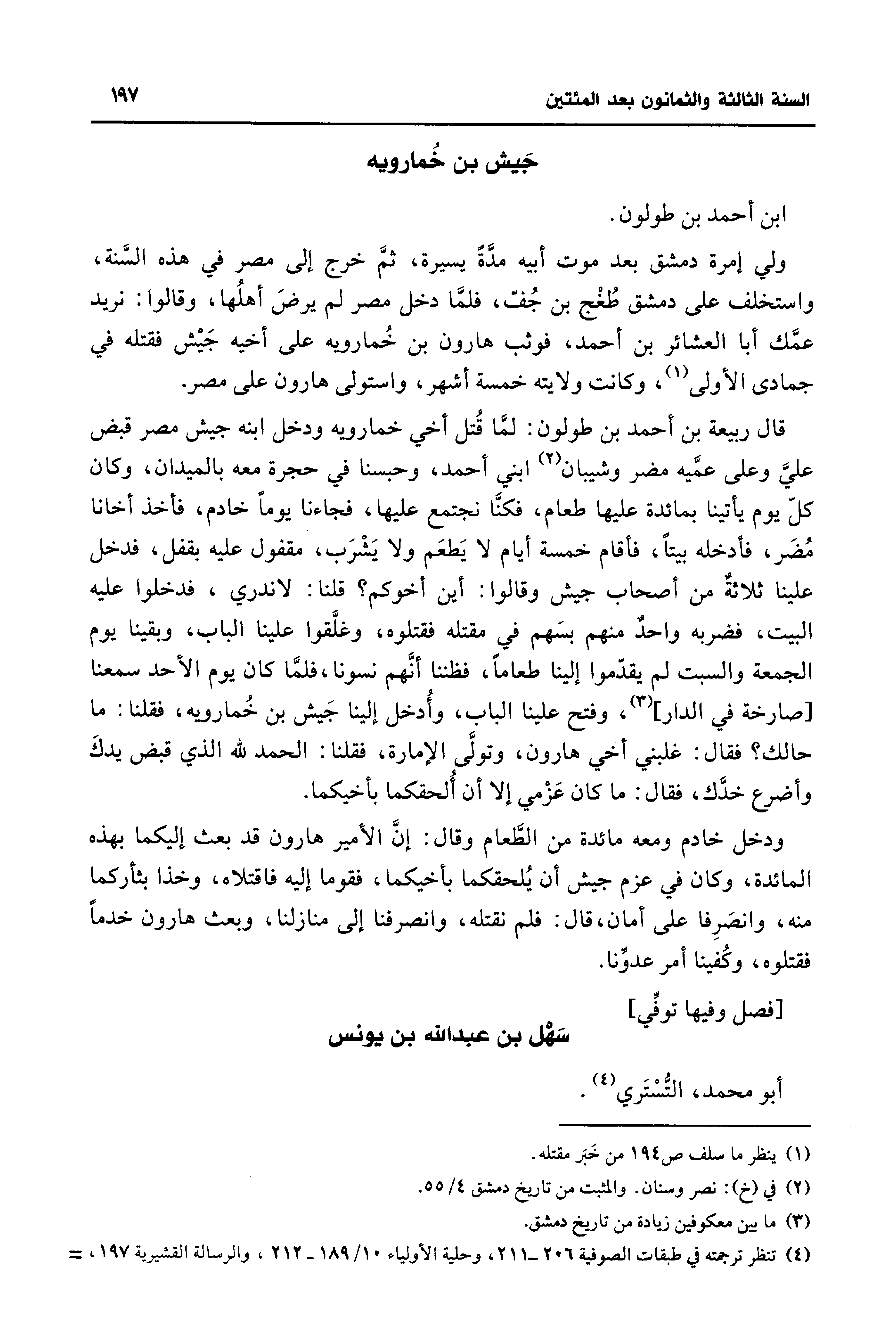قال ربيعة بن أحمد بن طولون: لمَّا قُتل أخي خمارويه ودخل ابنه جيش مصر قبض عليَّ وعلى عمَّيه مضر وشيبان (¬2) ابني أحمد، وحبسنا في حجرة معه بالميدان، وكان كلّ يوم يأتينا بمائدة عليها طعام، فكنَّا نجتمع عليها، فجاءنا يومًا خادم، فأخذ أخانا مُضَر، فأدخله بيتًا، فأقام خمسة أيام لا يَطعَم ولا يَشْرَب، مقفول عليه بقفل، فدخل علينا ثلاثةٌ من أصحاب جيش وقالوا: أين أخوكم؟ قلنا: لا ندري، فدخلوا عليه البيت، فضربه واحدٌ منهم بسَهم في مقتله فقتلوه، وغلَّقوا علينا الباب، وبقينا يوم الجمعة والسبت لم يقدّموا إلينا طعامًا، فظننا أنَّهم نسونا، فلمَّا كان يوم الأحد سمعنا [صارخة في الدار] (¬3)، وفتح علينا الباب، وأُدخل إلينا جَيش بن خُمارويه، فقلنا: ما حالك؛ فقال: غلبني أخي هارون، وتولَّى الإمارة، فقلنا: الحمد لله الَّذي قبض يدكَ وأضرع خدَّك، فقال: ما كان عَزْمي إلا أن أُلحقكما بأخيكما.