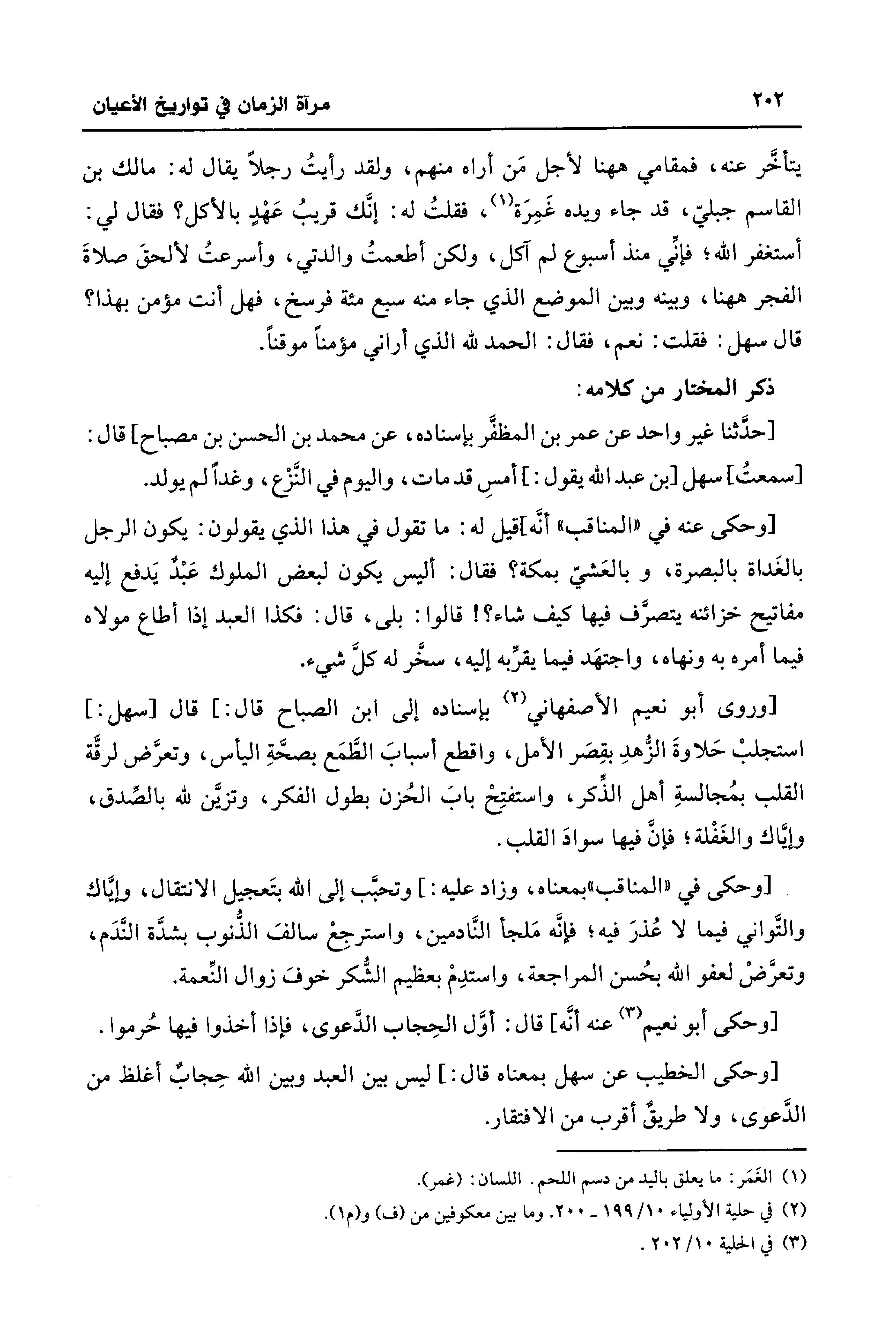 يتأخَّر عنه، فمقامي ها هنا لأجل مَن أراه منهم، ولقد رأيتُ رجلًا يقال له: مالك بن القاسم جبليّ، قد جاء ويده غَمِرَة (¬1)، فقلتُ له: إنَّك قريبُ عَهْدٍ بالأكل؟ فقال لي: أستغفر الله؛ فإنِّي منذ أسبوع لم آكل، ولكن أطعمتُ والدتي، وأسرعتُ لألحقَ صلاةَ الفجر ها هنا، وبينه وبين الموضع الَّذي جاء منه سبع مئة فرسخ، فهل أنت مؤمن بهذا؟ قال سهل: فقلت: نعم، فقال: الحمد لله الَّذي أراني مؤمنًا موقنًا.