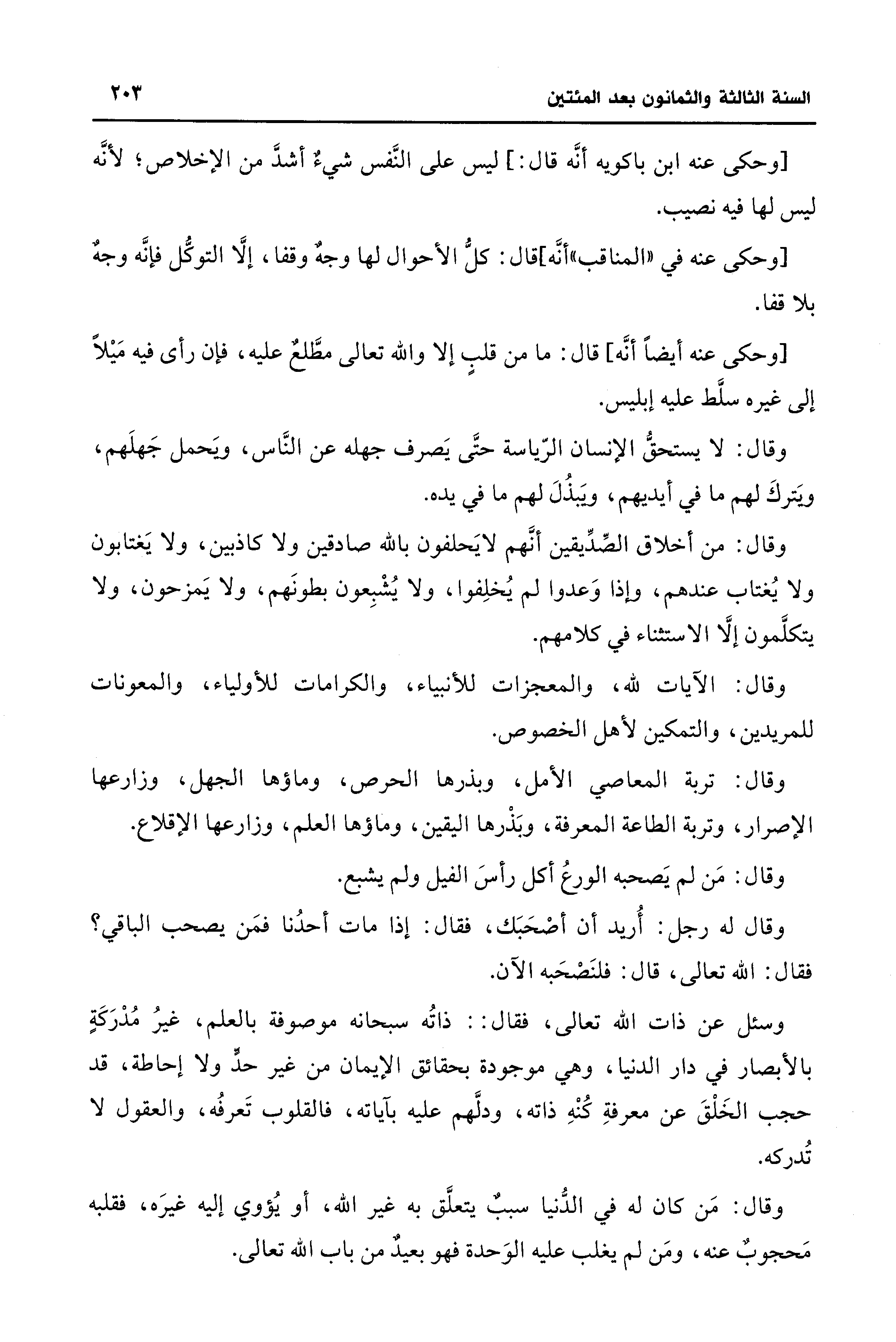[وحكى عنه ابن باكويه أنَّه قال: ] ليس على النَّفس شيءٌ أشدَّ من الإخلاص؛ لأنَّه ليس لها فيه نصيب.