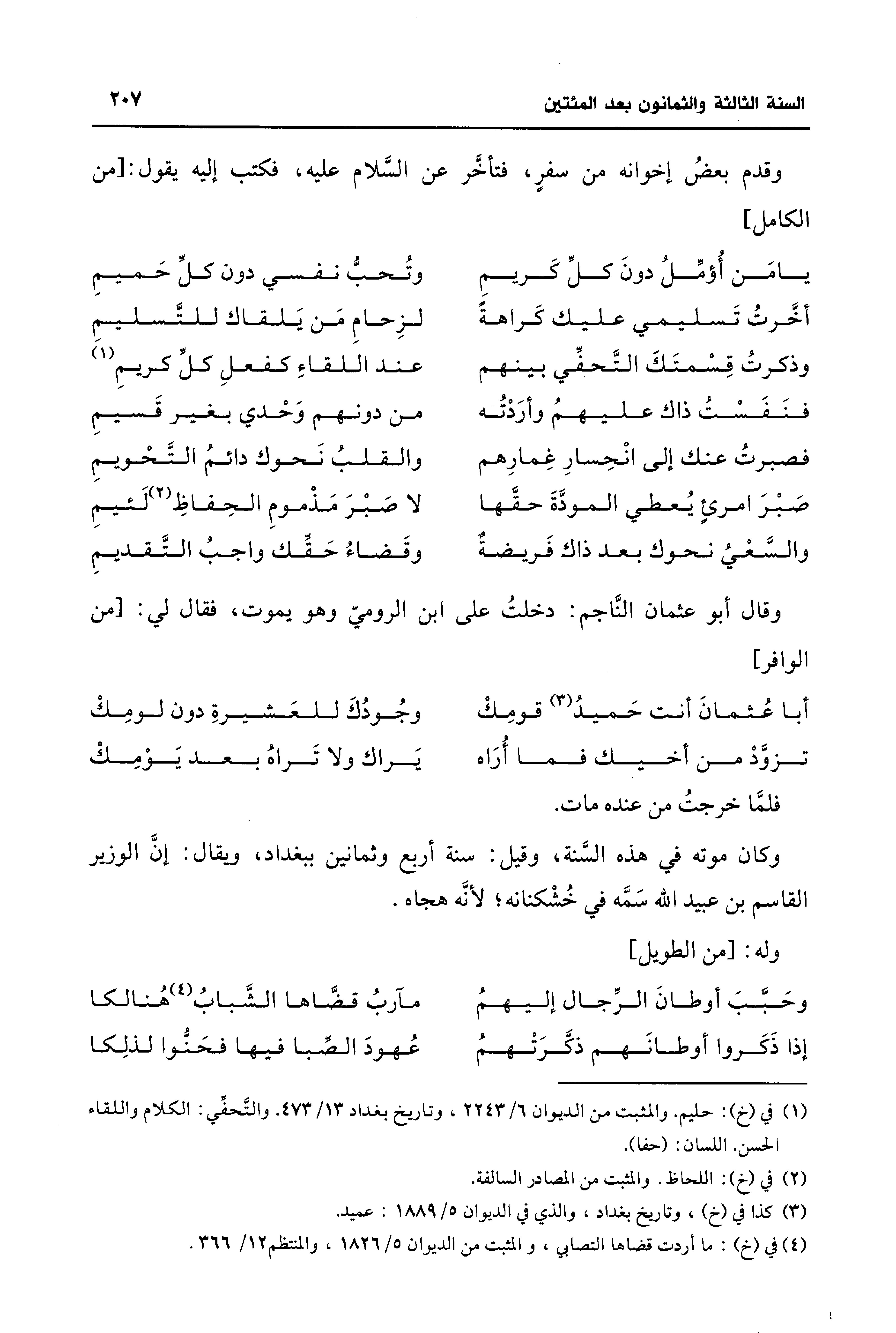 وقال أبو عثمان النَّاجم: دخلتُ على ابن الروميّ وهو يموت، فقال لي: [من الوافر]