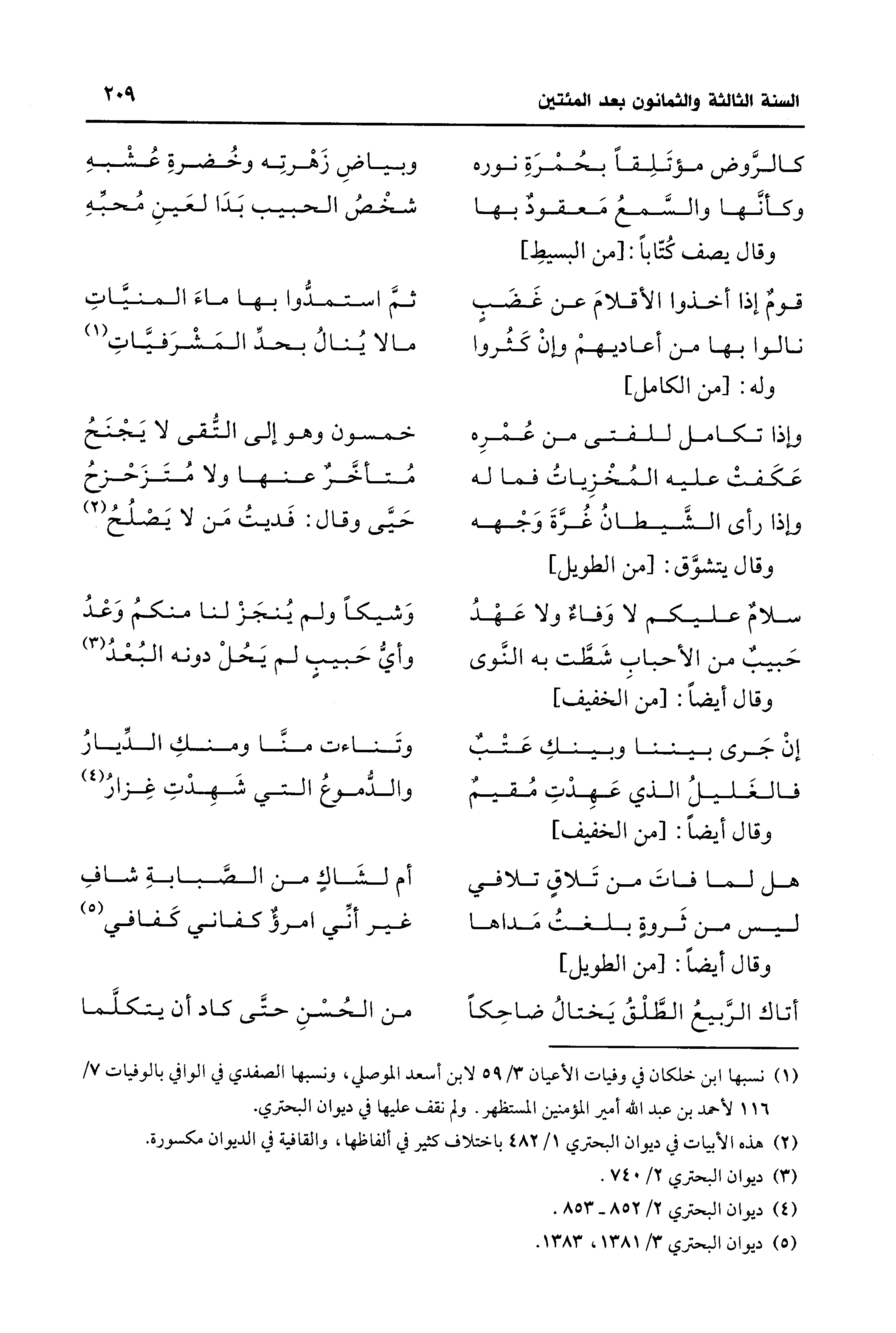(¬1) نسبها ابن خلكان في وفيات الأعيان 3/ 59 لابن أسعد الموصلي، ونسبها الصفدي في الوافي بالوفيات 7/ 116 لأحمد بن عبد الله أمير المؤمنين المستظهر. ولم نقف عليها في ديوان البحتري.