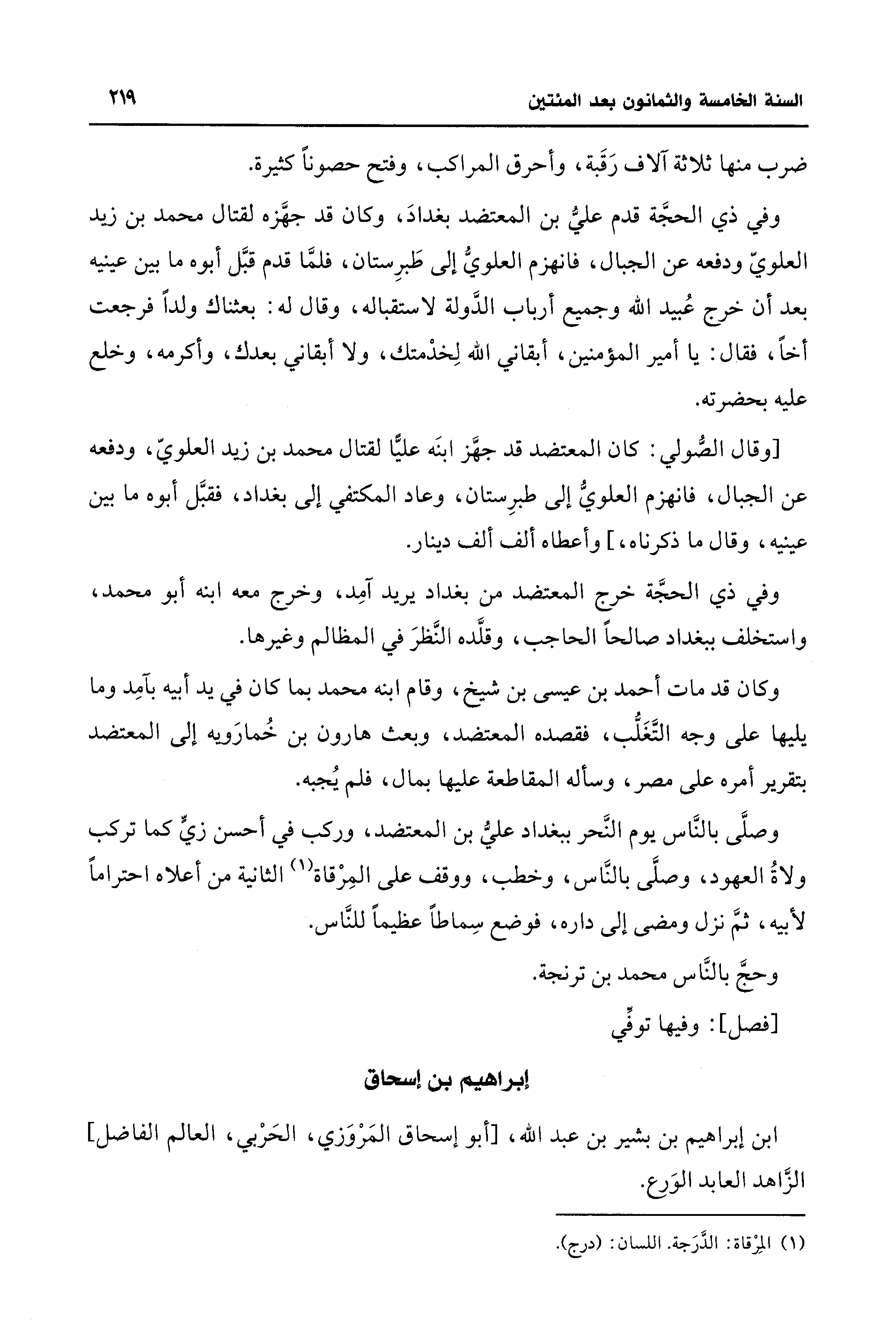 وصلَّى بالنَّاس يوم النَّحر ببغداد عليُّ بن المعتضد، وركب في أحسن زيٍّ كما تركب ولاةُ العهود، وصلَّى بالنَّاس، وخطب، ووقف على المِرْقاة (¬1) الثانية من أعلاه احترامًا لأبيه، ثمَّ نزل ومضى إلى داره، فوضع سِماطًا عظيمًا للنَّاس.