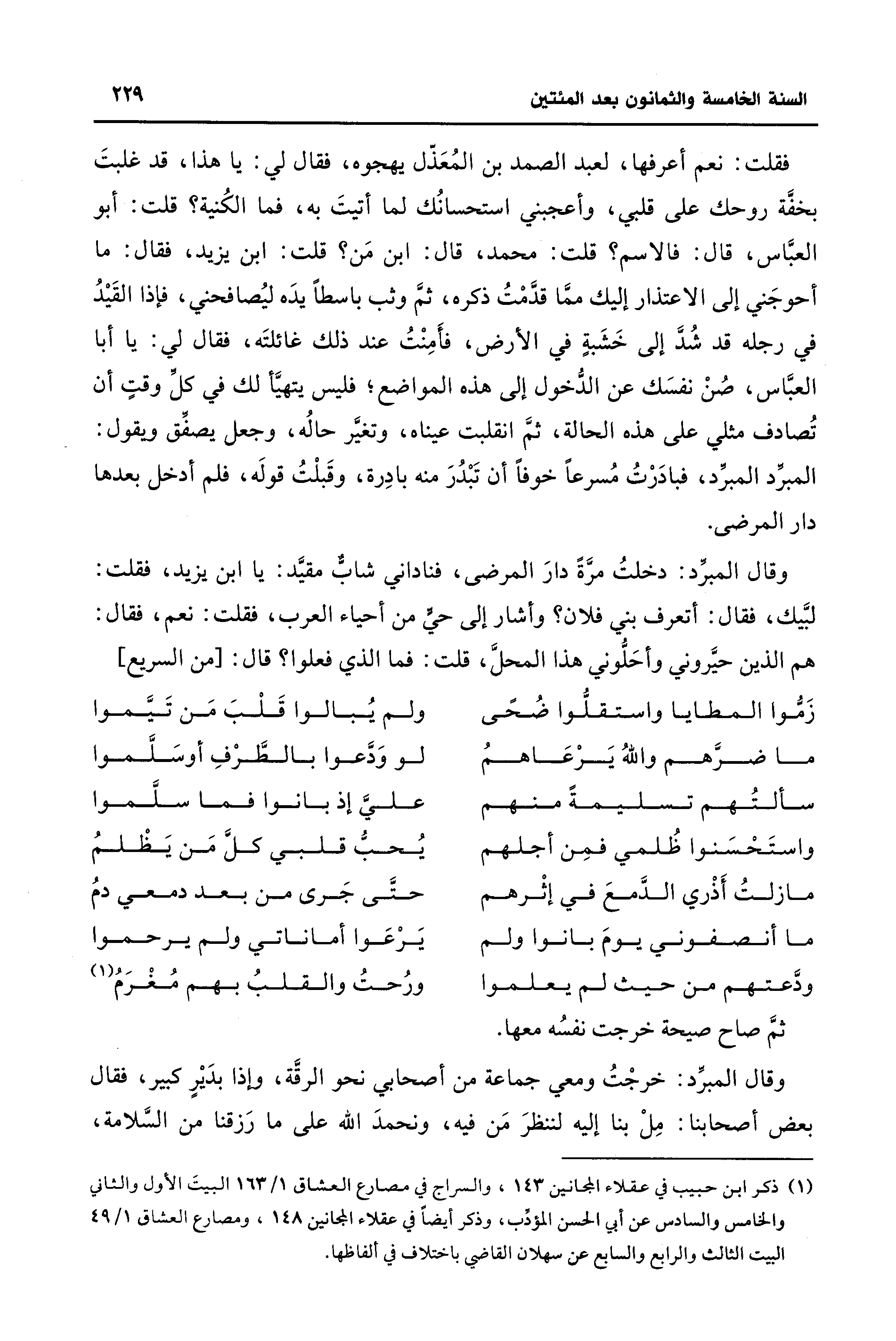 فقلت: نعم أعرفها, لعبد الصمد بن المُعَذّل يهجوه، فقال لي: يا هذا، قد غلبتَ بخفَّة روحك على قلبي، وأعجبني استحسانُك لما أتيتَ به، فما الكُنية؟ قلت: أبو العبَّاس، قال: فالاسم؟ قلت: محمَّد، قال: ابن مَن؟ قلت: ابن يزيد، فقال: ما أحوجَني إلى الاعتذار إليك ممَّا قدَّمْتُ ذكره، ثمَّ وثب باسطًا يدَه ليُصافحني، فإذا القَيدُ في رجله قد شُدَّ إلى خَشَبةٍ في الأرض، فأَمِنْتُ عند ذلك غائلتَه، فقال لي: يا أبا العبَّاس، صُنْ نفسَك عن الدُّخول إلى هذه المواضع؟ فليس يتهيَّأ لك في كلّ وقتٍ أن تُصادف مثلي على هذه الحالة، ثمَّ انقلبت عيناه، وتغيَّر حالُه، وجعل يصفق ويقول: المبرد المبرّد، فبادَرْتُ مُسرعًا خوفًا أن تَبْدُرَ منه بادِرة، وقَبلْتُ قولَه، فلم أدخل بعدها دار المرضى.