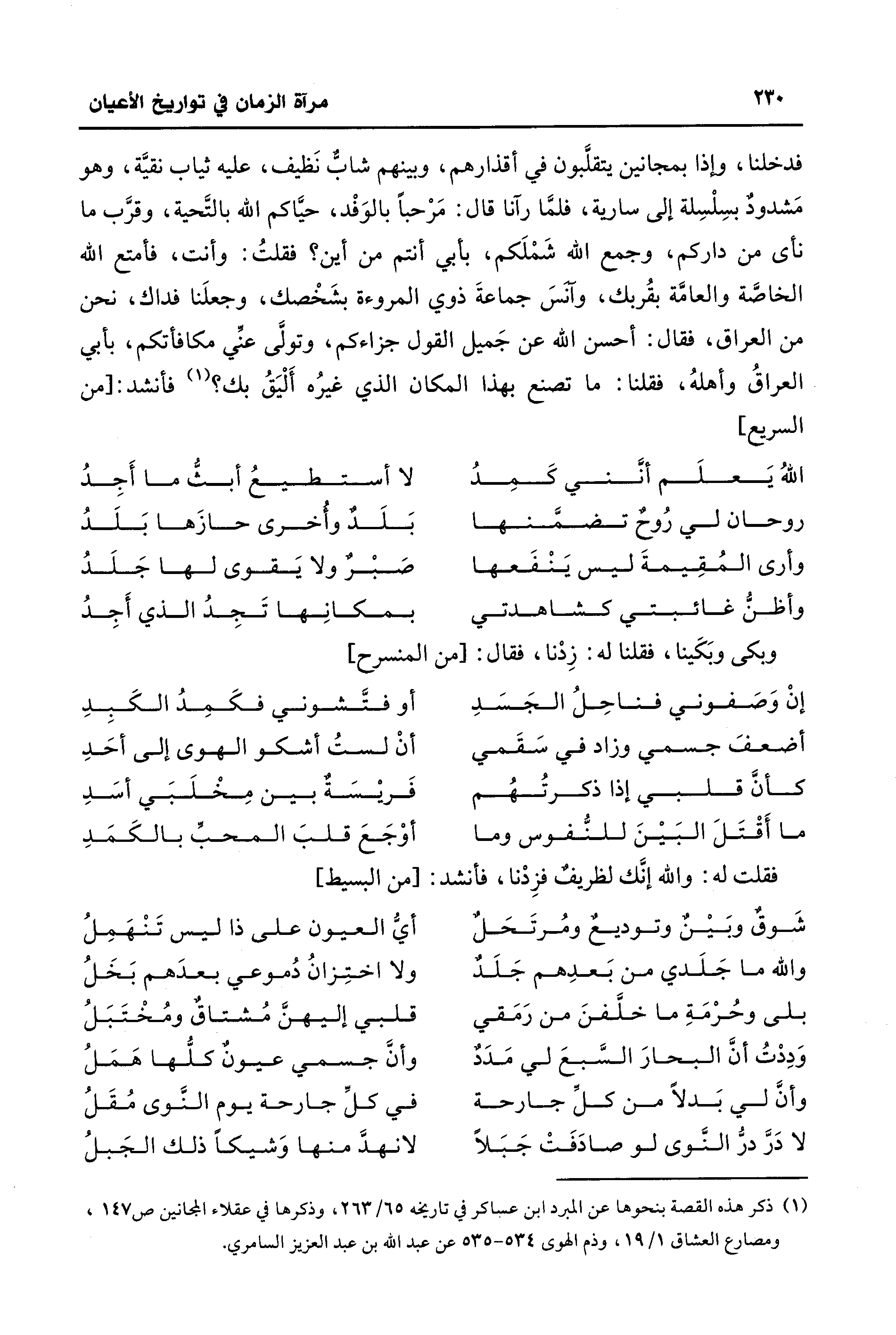 فدخلنا، وإذا بمجانين يتقلَّبون في أقذارهم، وبينهم شابٌّ نَظيف، عليه ثياب نقيَّة، وهو مَشدودٌ بسِلْسِلة إلى سارية، فلمَّا رآنا قال: مَرْحبًا بالوَفْد، حيَّاكم الله بالتَّحية، وقرَّب ما نأى من داركم، وجمع الله شَمْلَكم، بأبي أنتم من أين؟ فقلتُ: وأنت، فأمتع الله الخاصَّة والعامَّة بقُربك، وآنسَ جماعةَ ذوي المروءة بشَخْصك، وجعلَنا فداك، نحن من العراق، فقال: أحسن الله عن جَميل القول جزاءكم، وتولَّى عنِّي مكافأتكم، بأبي العراقُ وأهلهُ، فقلنا: ما تصنع بهذا المكان الذي غيرُه أَلْيَقُ بك؟ (¬1) فأنشد: [من السريع]