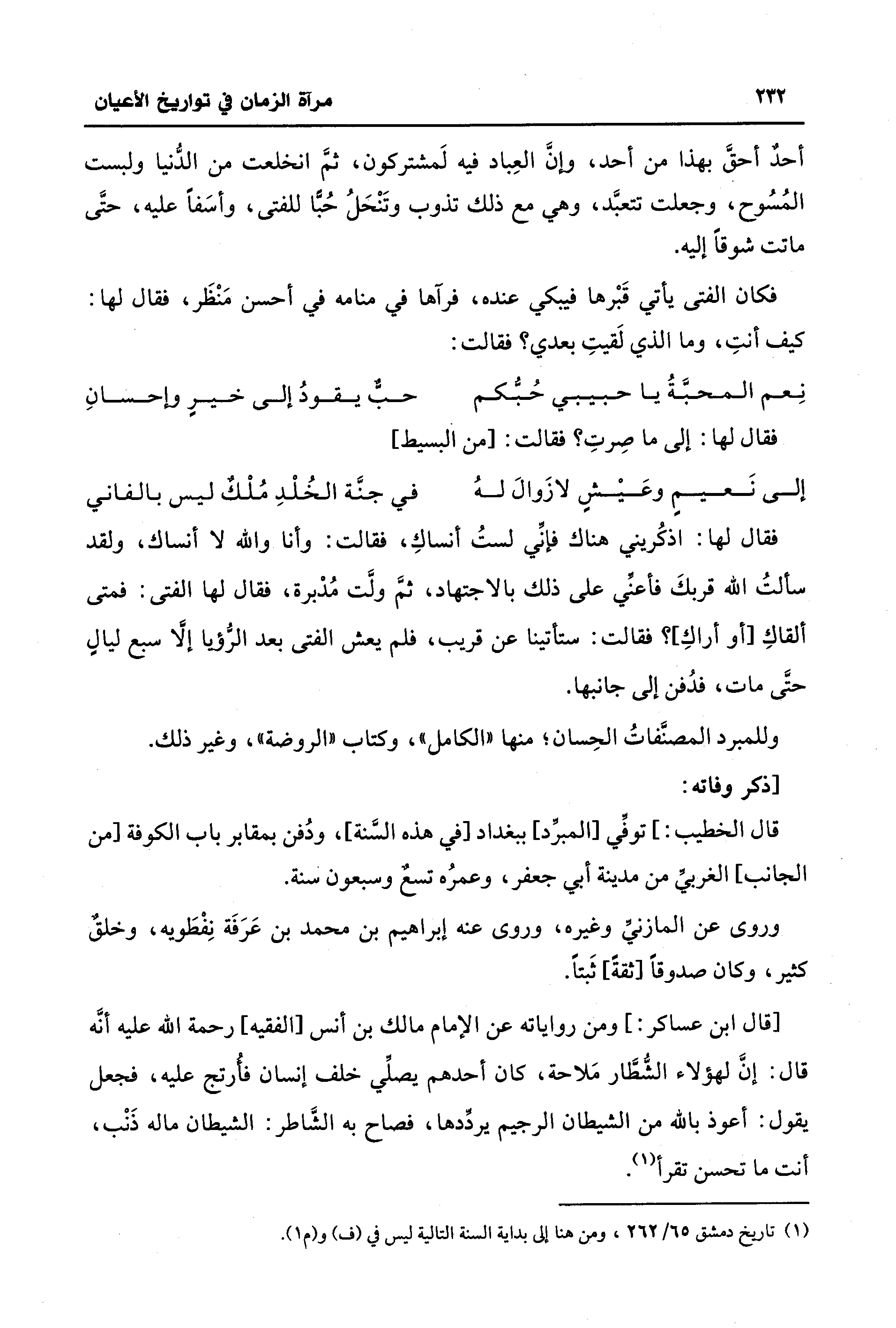 أحدٌ أحقَّ بهذا من أحد، وإنَّ العِباد فيه لَمشتركون، ثمَّ انخلعت من الدُّنيا ولبست المُسُوح، وجعلت تتعبَّد، وهي مع ذلك تذوب وتَنْحَلُ حبًّا للفتى، وأسَفًا عليه، حتَّى ماتت شوقًا إليه.