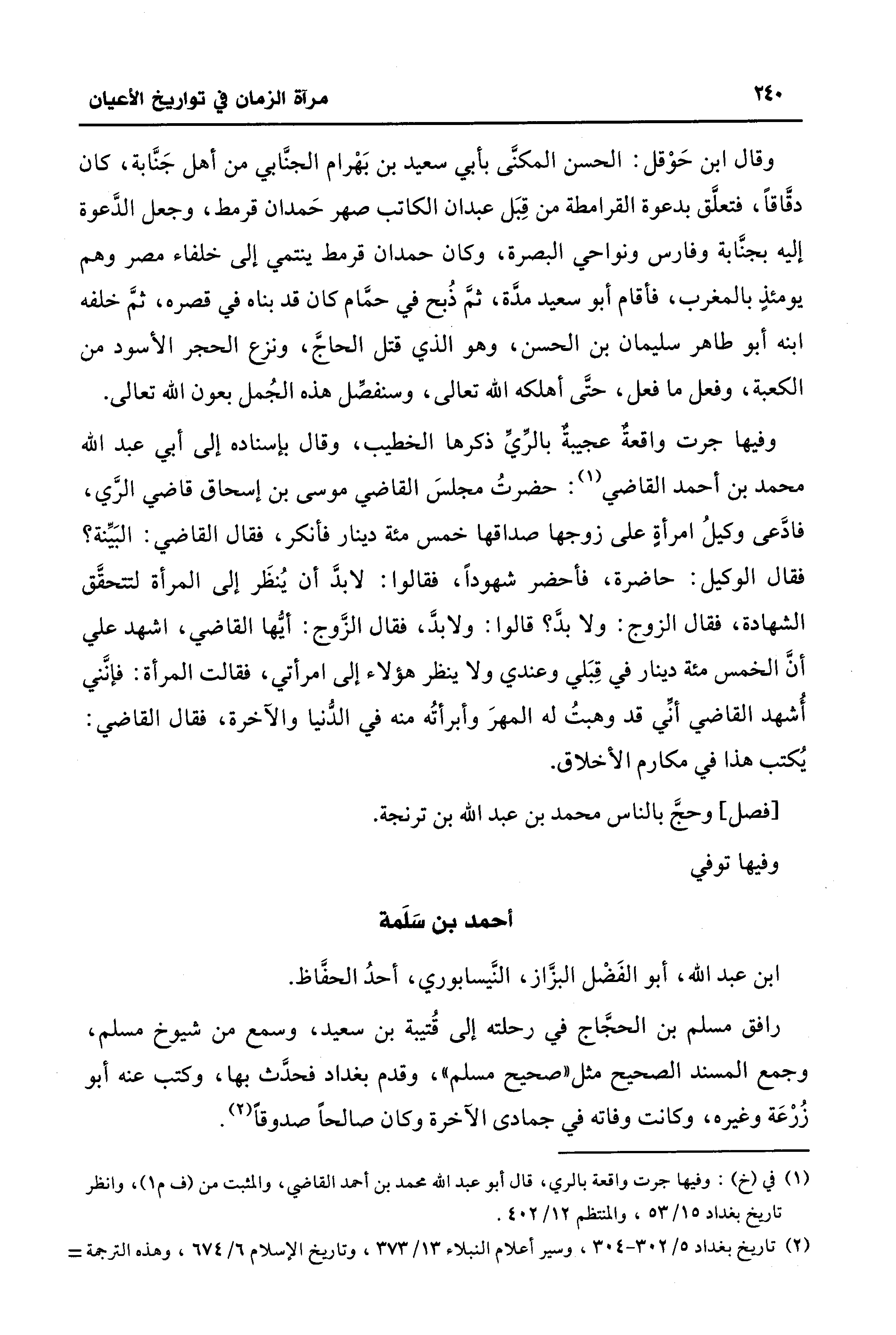 وفيها جرت واقعةٌ عجيبةٌ بالرِّيِّ ذكرها الخطيب، وقال بإسناده إلى أبي عبد الله محمَّد بن أحمد القاضي (¬1): حضرتُ مجلسَ القاضي موسى بن إسحاق قاضي الرَّي، فادَّعى وكيلُ امرأةٍ على زوجها صداقها خمس مئة دينار فأنكر، فقال القاضي: البَيِّنة؟ فقال الوكيل: حاضرة، فأحضر شهودًا، فقالوا: لا بدَّ أن يُنظَر إلى المرأة لتتحقَّق الشهادة، فقال الزوج: ولا بد؟ قالوا: ولا بدَّ، فقال الزوج: أيُّها القاضي، اشهد علي أنَّ الخمس مئة دينار في قِبَلي وعندي ولا ينظر هؤلاء إلى امرأتي، فقالت المرأة: فإنَّني أُشهد القاضي أنِّي قد وهبتُ له المهرَ وأبرأتُه منه في الدُّنيا والآخرة، فقال القاضي: يُكتب هذا في مكارم الأخلاق.