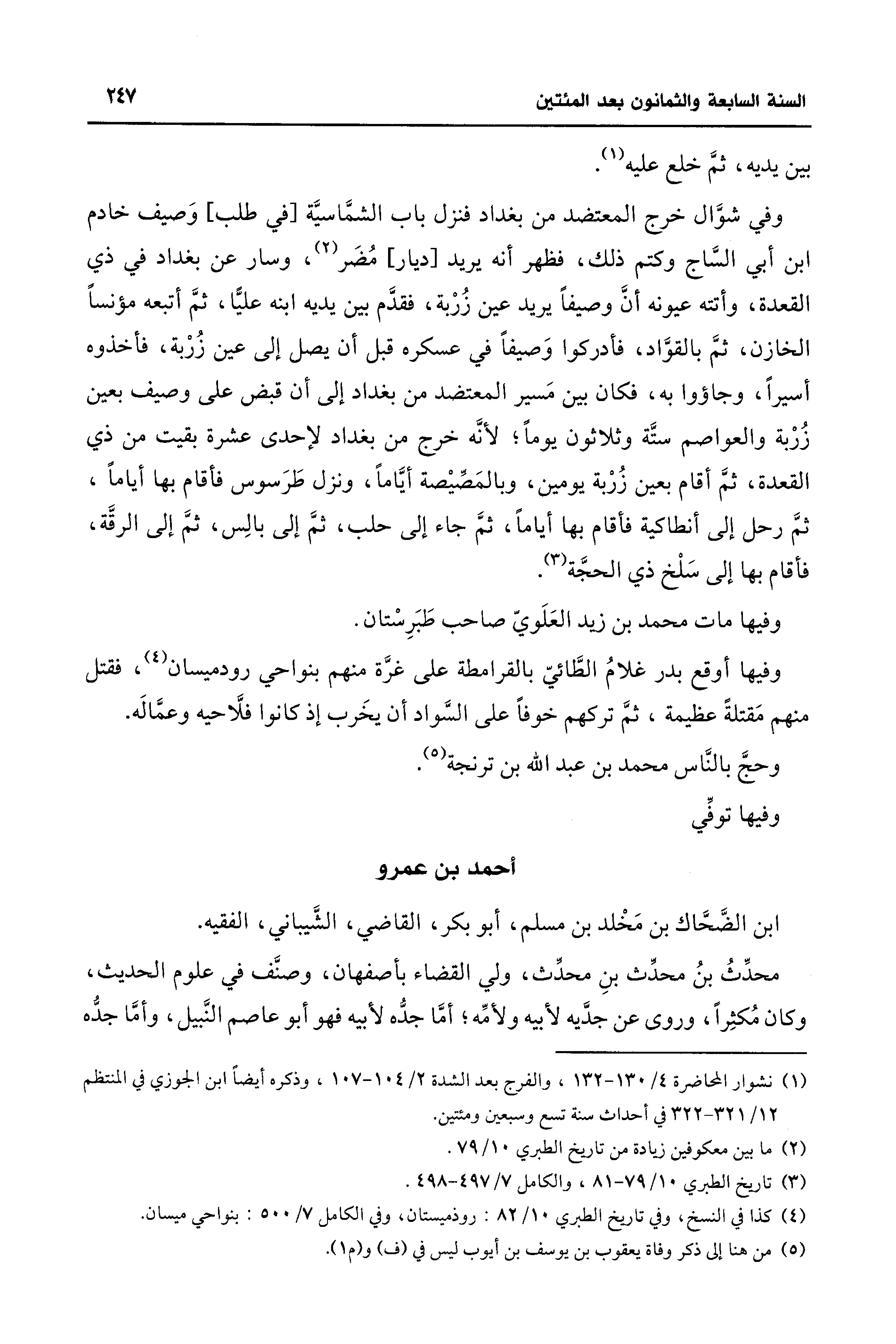 وفيها أوقع بدر غلامُ الطَّائيّ بالقرامطة على غرَّة منهم بنواحي رودميسان (¬4)، فقتل منهم مَقتلةً عظيمة، ثمَّ تركهم خوفًا على السَّواد أن يخَرب إذ كانوا فلَّاحيه وعمَّاله.