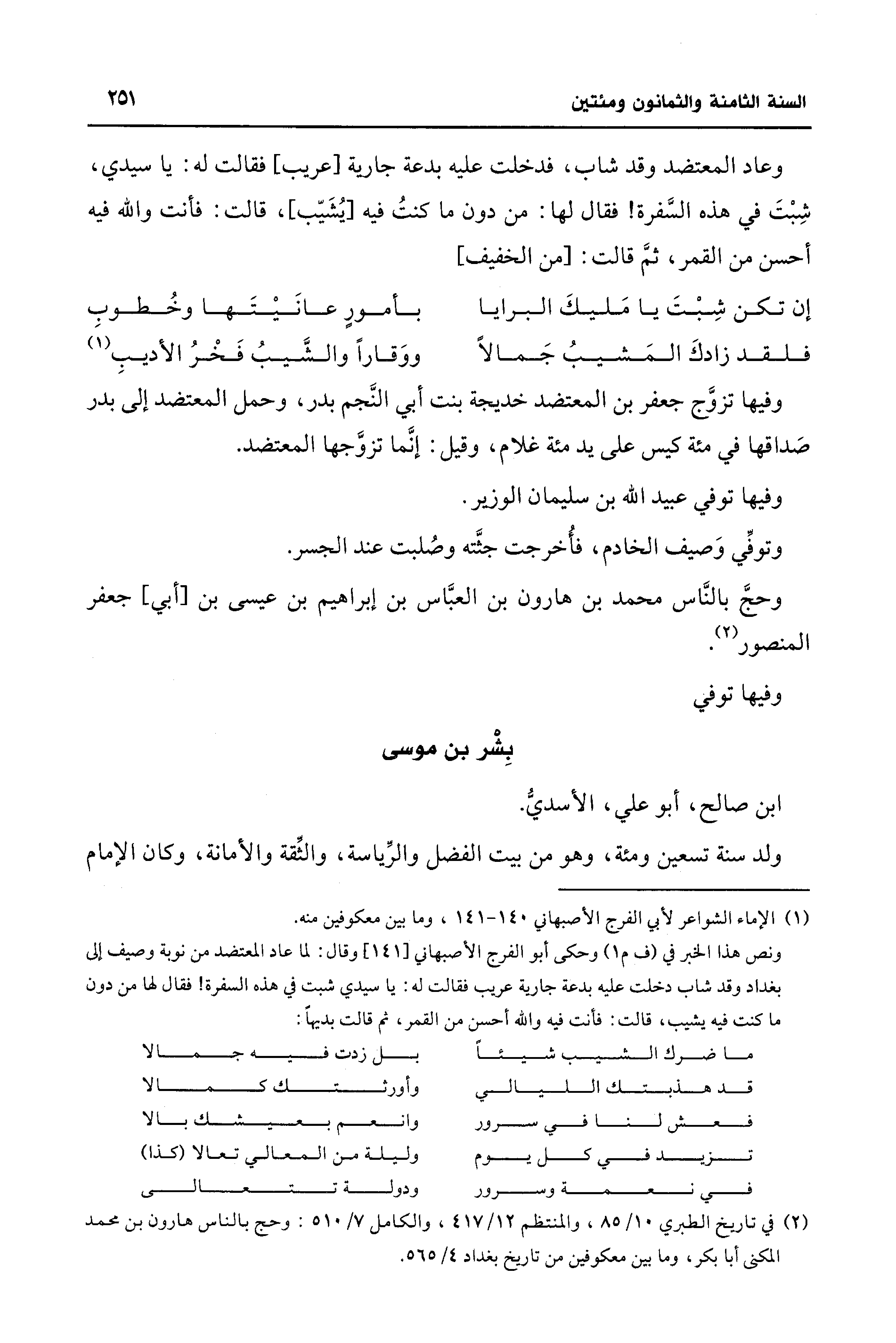 ونص هذا الخبر في (ف م 1) وحكى أبو الفرج الأصبهاني [141] وقال: لما عاد المعتضد من نوبة وصيف إلى بغداد وقد شاب دخلت عليه بدعة جارية عريب فقالت له: يا سيدي شبت في هذه السفرة! فقال لها من دون ما كنت فيه يشيب، قالت: فأنت فيه والله أحسن من القمر، ثم قالت بديهًا: