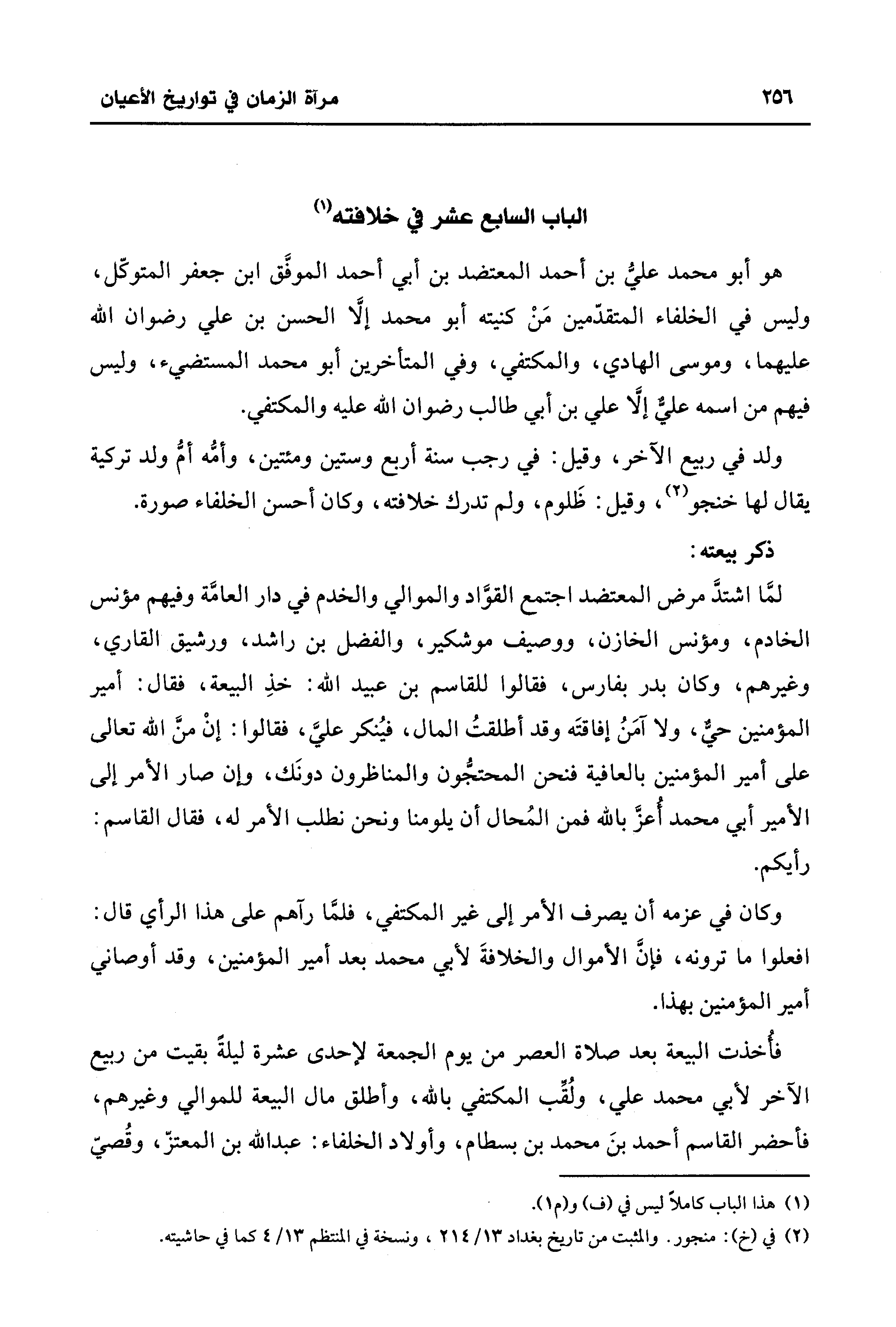 وكان في عزمه أن يصرف الأمر إلى غير المكتفي، فلمَّا رآهم على هذا الرأي قال: افعلوا ما ترونه، فإنَّ الأموال والخلافةَ لأبي محمَّد بعد أمير المؤمنين، وقد أوصاني أمير المؤمنين بهذا.