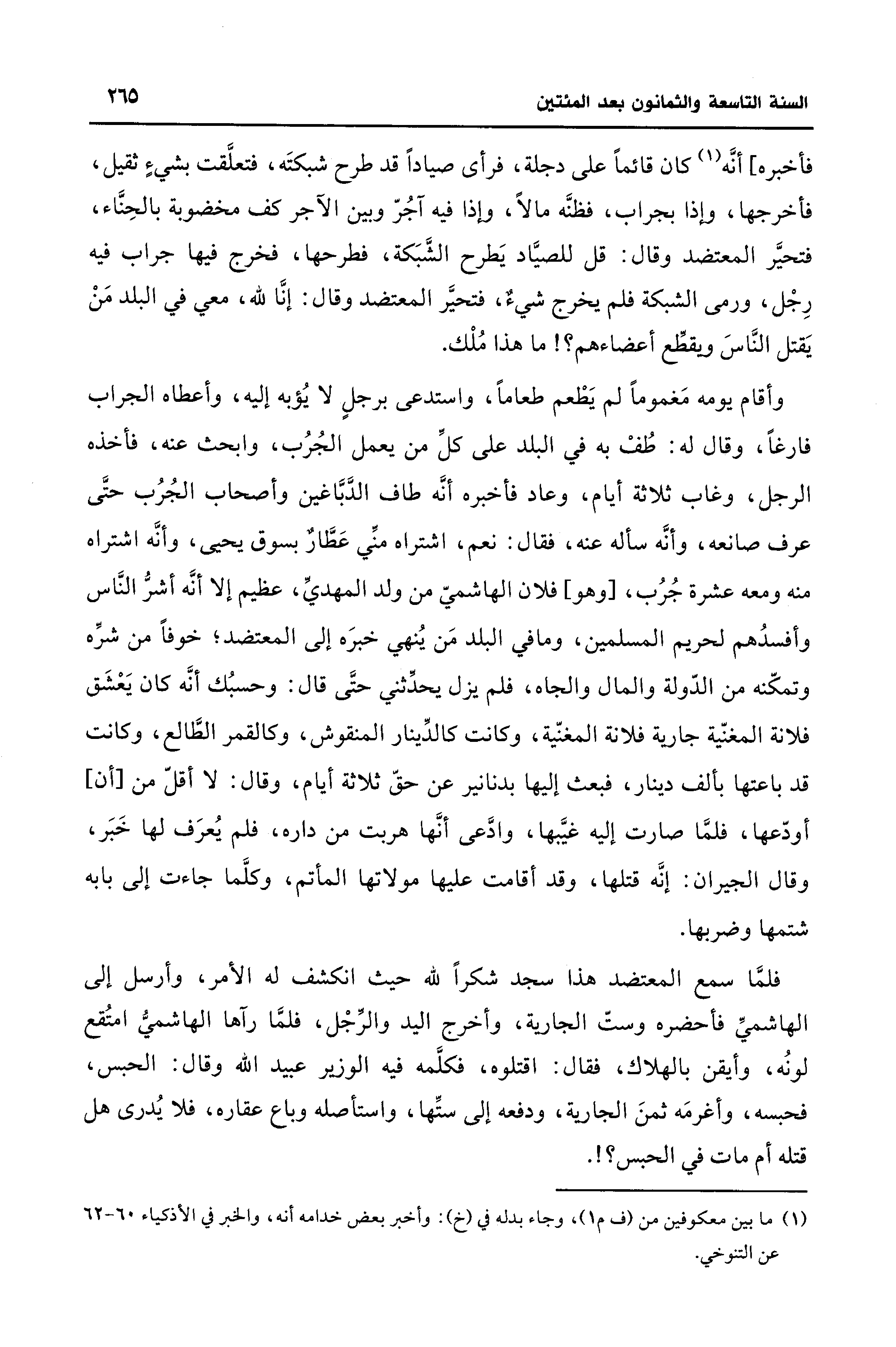 فأخبره] أنَّه (¬1) كان قائمًا على دجلة، فرأى صيادًا قد طرح شبكتَه، فتعلَّقت بشيءٍ ثقيل، فأخرجها، وإذا بجراب، فظنَّه مالًا، وإذا فيه آجُرّ وبين الآجر كف مخضوبة بالحِنَّاء، فتحيَّر المعتضد وقال: قل للصيَّاد يَطرح الشَّبَكة، فطرحها، فخرج فيها جراب فيه رِجْل، ورمى الشبكة فلم يخرج شيءٌ، فتحيَّر المعتضد وقال: إنَّا لله، معي في البلد مَنْ يَقتل النَّاسَ ويقطِّع أعضاءهم؟ ! ما هذا مُلْك.