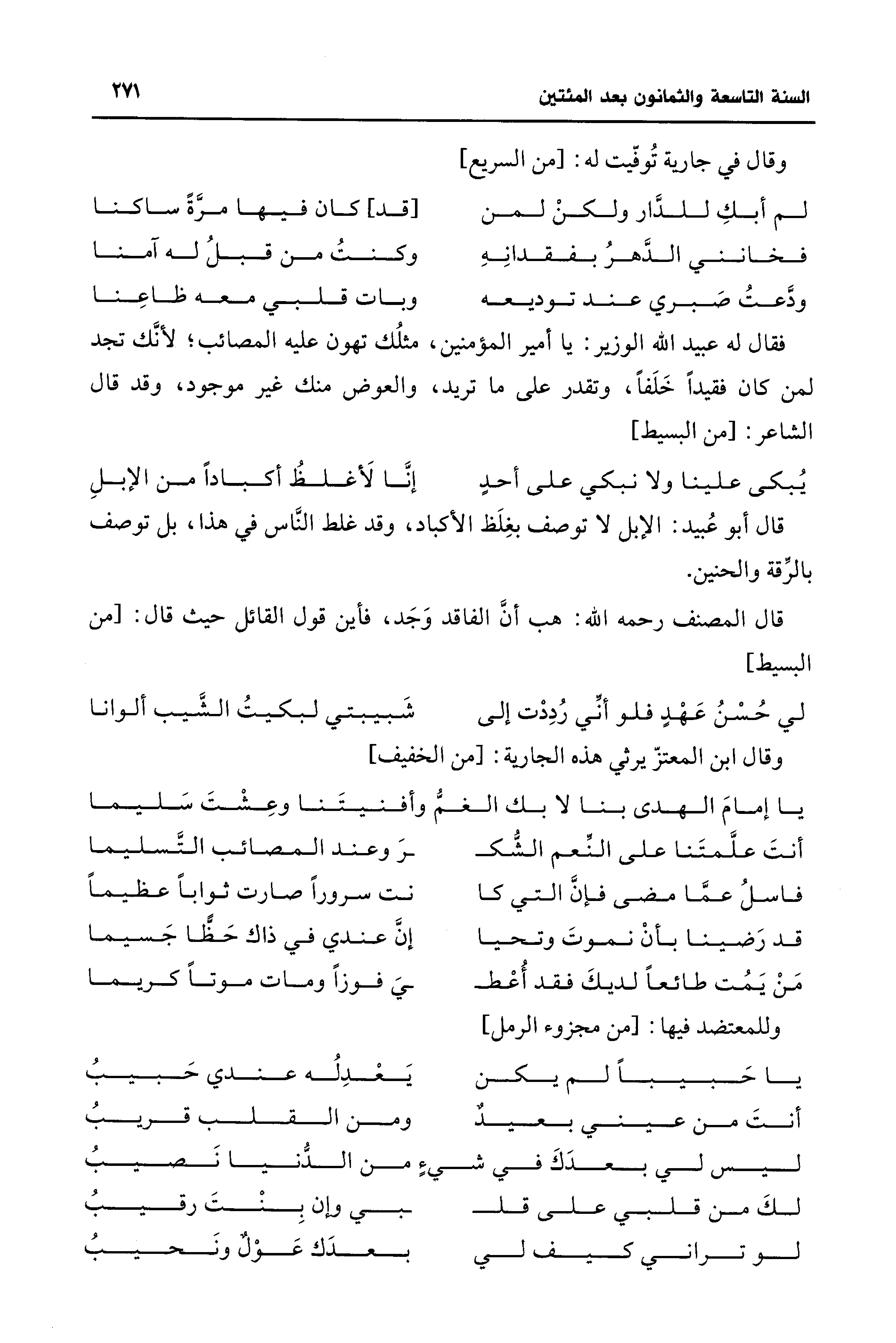 فقال له عبيد الله الوزير: يا أمير المؤمنين، مثلُك تهون عليه المصائب؛ لأنَّك تجد لمن كان فقيدًا خَلَفًا، وتقدر على ما تريد، والعوض منك غير موجود، وقد قال الشاعر: [من البسيط]