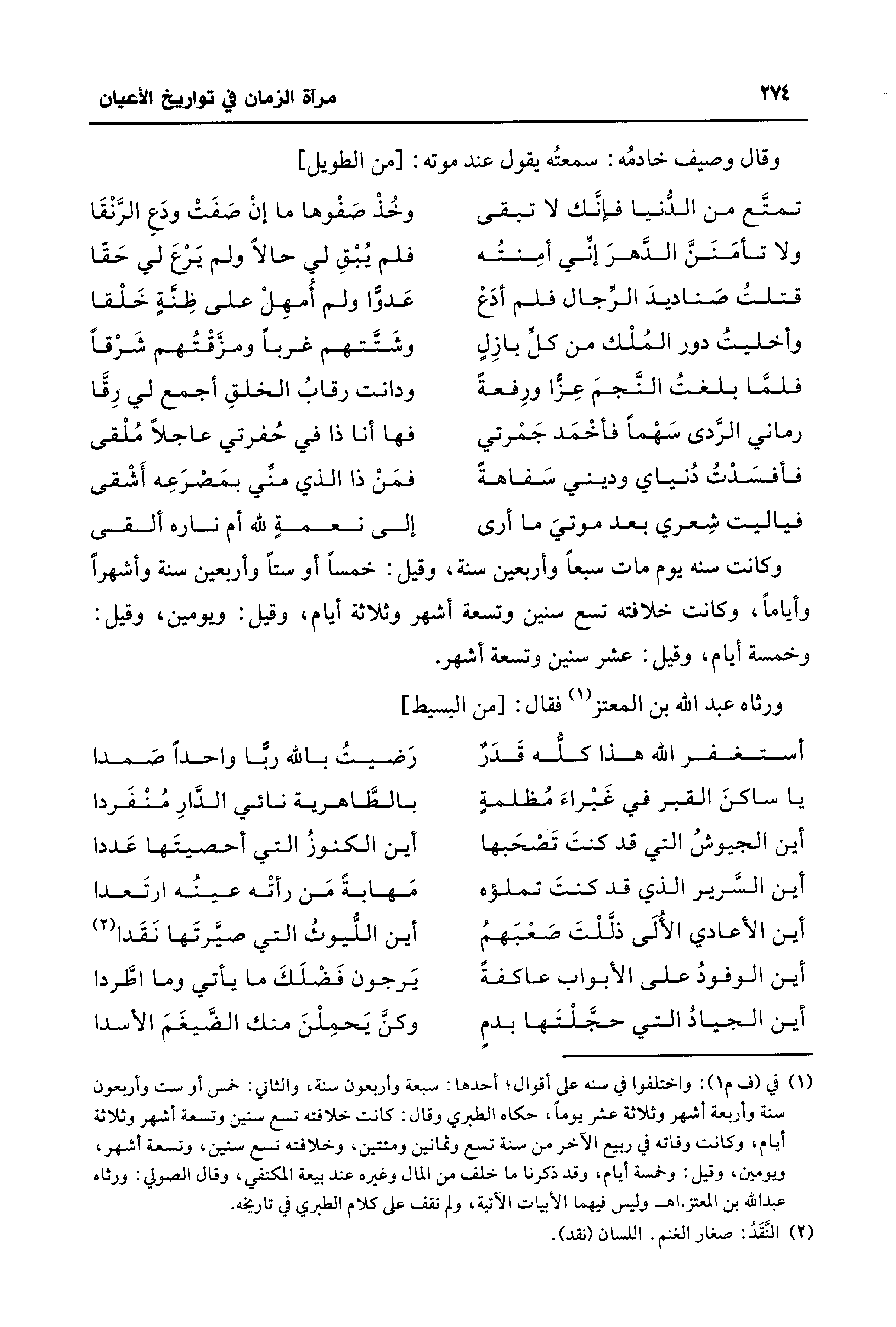 (¬1) في (ف م 1): واختلفوا في سنه على أقوال؛ أحدها: سبعة وأربعون سنة، والثاني: خمس أو ست وأربعون سنة وأربعة أشهر وثلاثة عشر يومًا، حكاه الطبري وقال: كانت خلافته تسع سنين وتسعة أشهر وثلاثة أيام، وكانت وفاته في ربيع الآخر من سنة تسع وثمانين ومئتين، وخلافته تسع سنين، وتسعة أشهر، ويومين، وقيل: وخمسة أيام، وقد ذكرنا ما خلف من المال وغيره عند بيعة المكتفي، وقال الصولي: ورثاه عبد الله بن المعتز. اهـ. وليس فيهما الأبيات الآتية، ولم نقف على كلام الطبري في تاريخه.