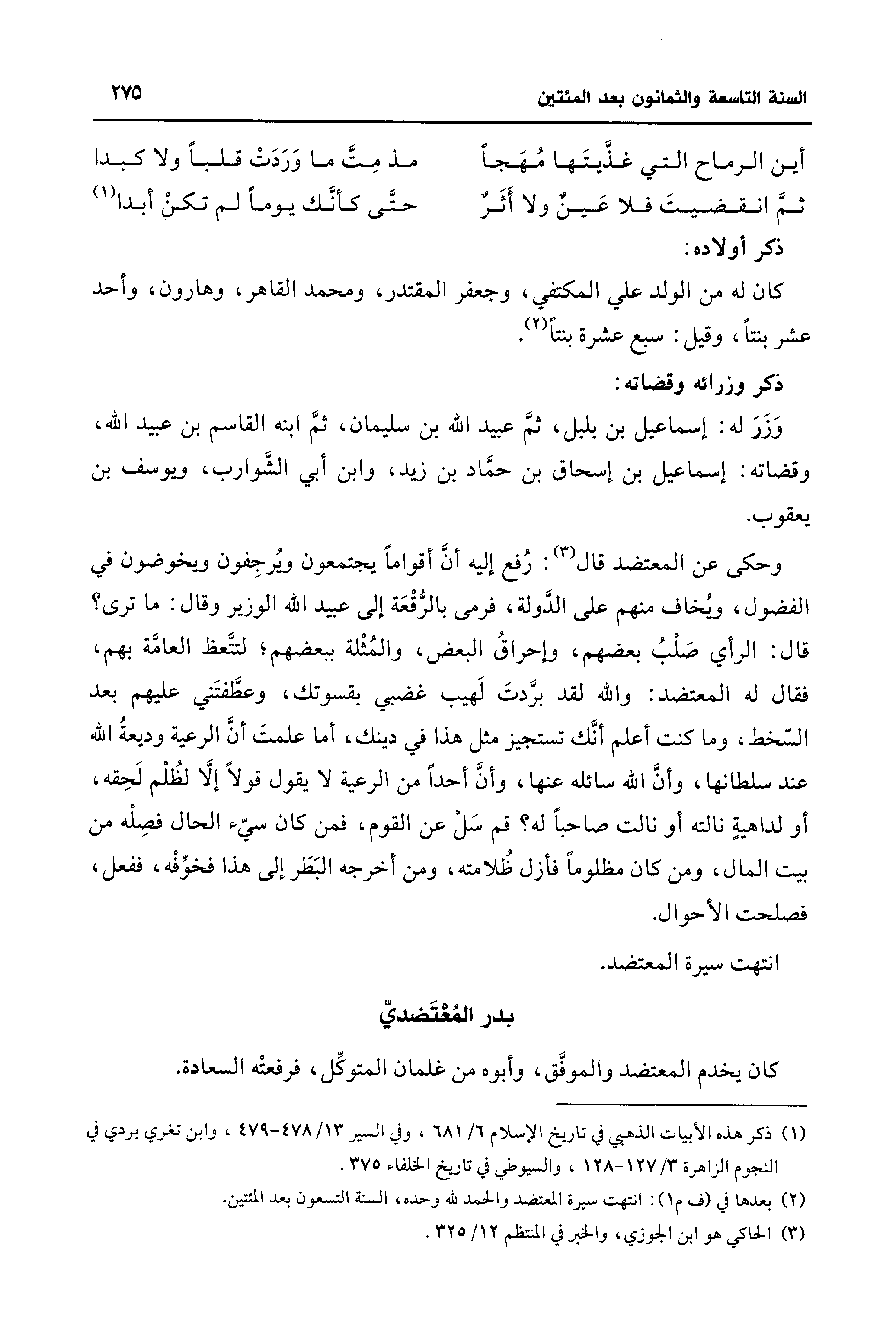 (¬1) ذكر هذه الأبيات الذهبي في تاريخ الإِسلام 6/ 681، وفي السير 13/ 478 - 479، وابن تغري بردي في النجوم الزاهرة 3/ 127 - 128، والسيوطي في تاريخ الخلفاء 375.