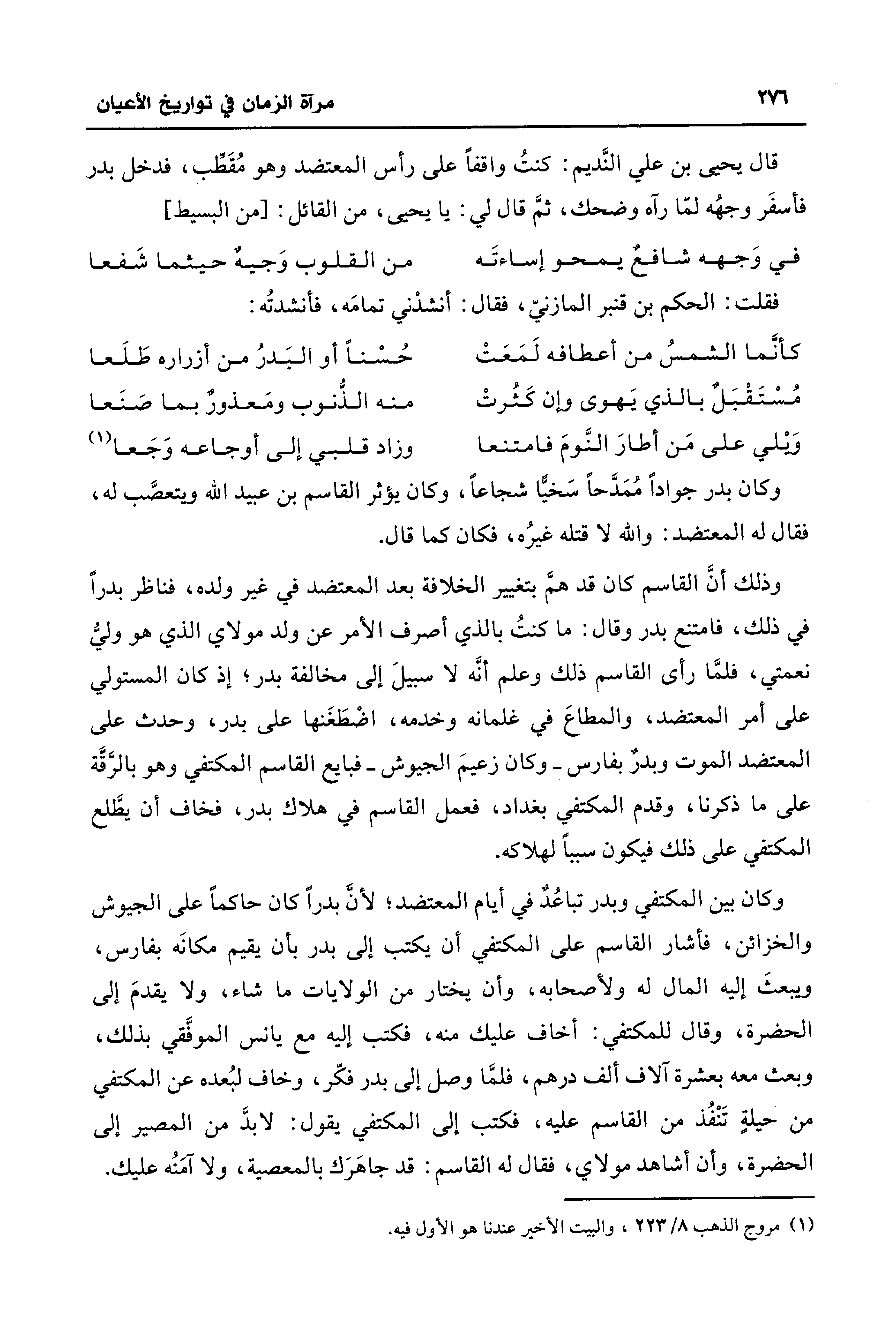 قال يحيى بن عليّ النَّديم: كنتُ واقفًا على رأس المعتضد وهو مُقَطِّب، فدخل بدر فأسفَر وجهُه لمّا رآه وضحك، ثمَّ قال لي: يَا يحيى، من القائل: [من البسيط]