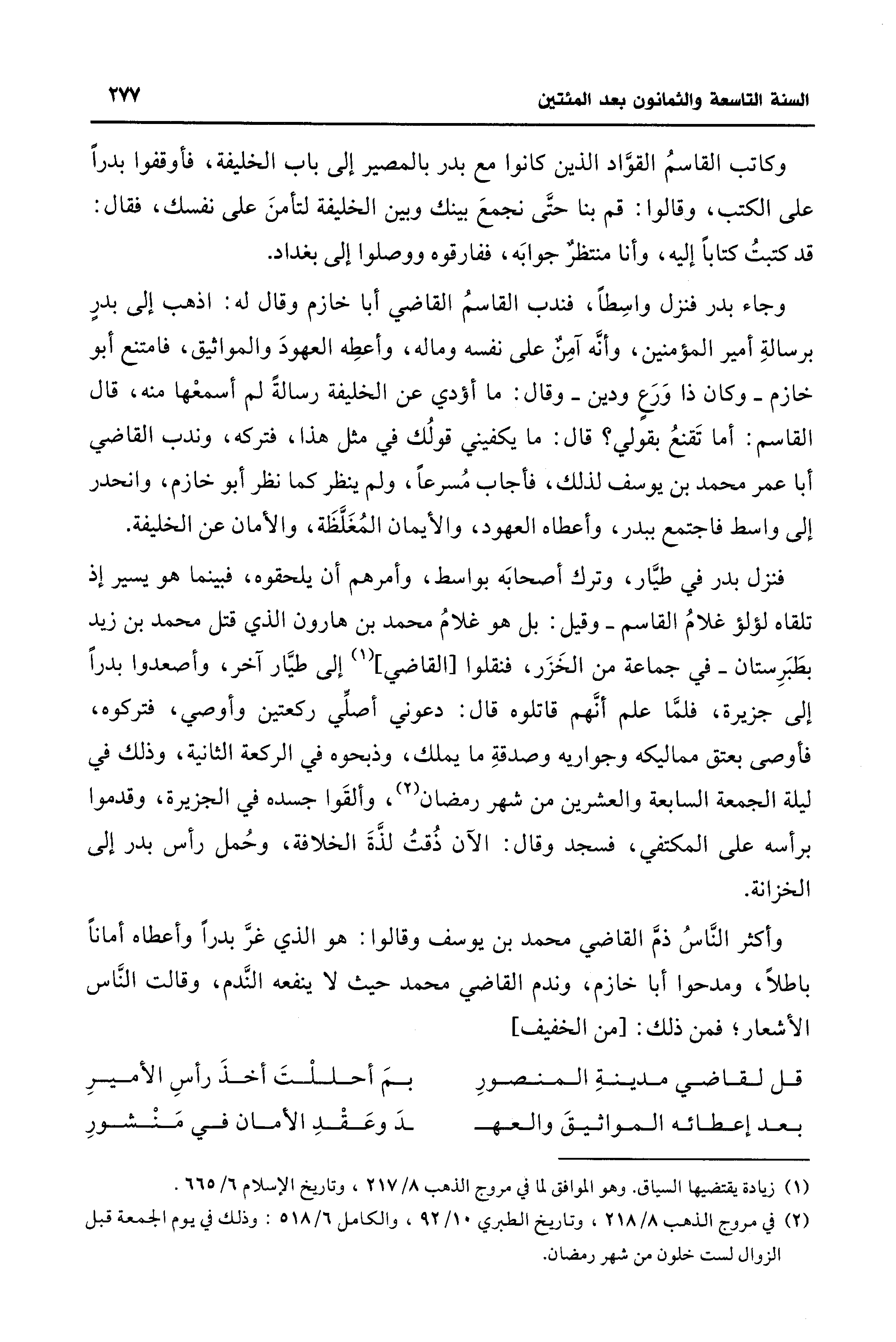 (¬1) زيادة يقتضيها السياق. وهو الموافق لما في مروج الذهب 8/ 217، وتاريخ الإِسلام 6/ 665.
