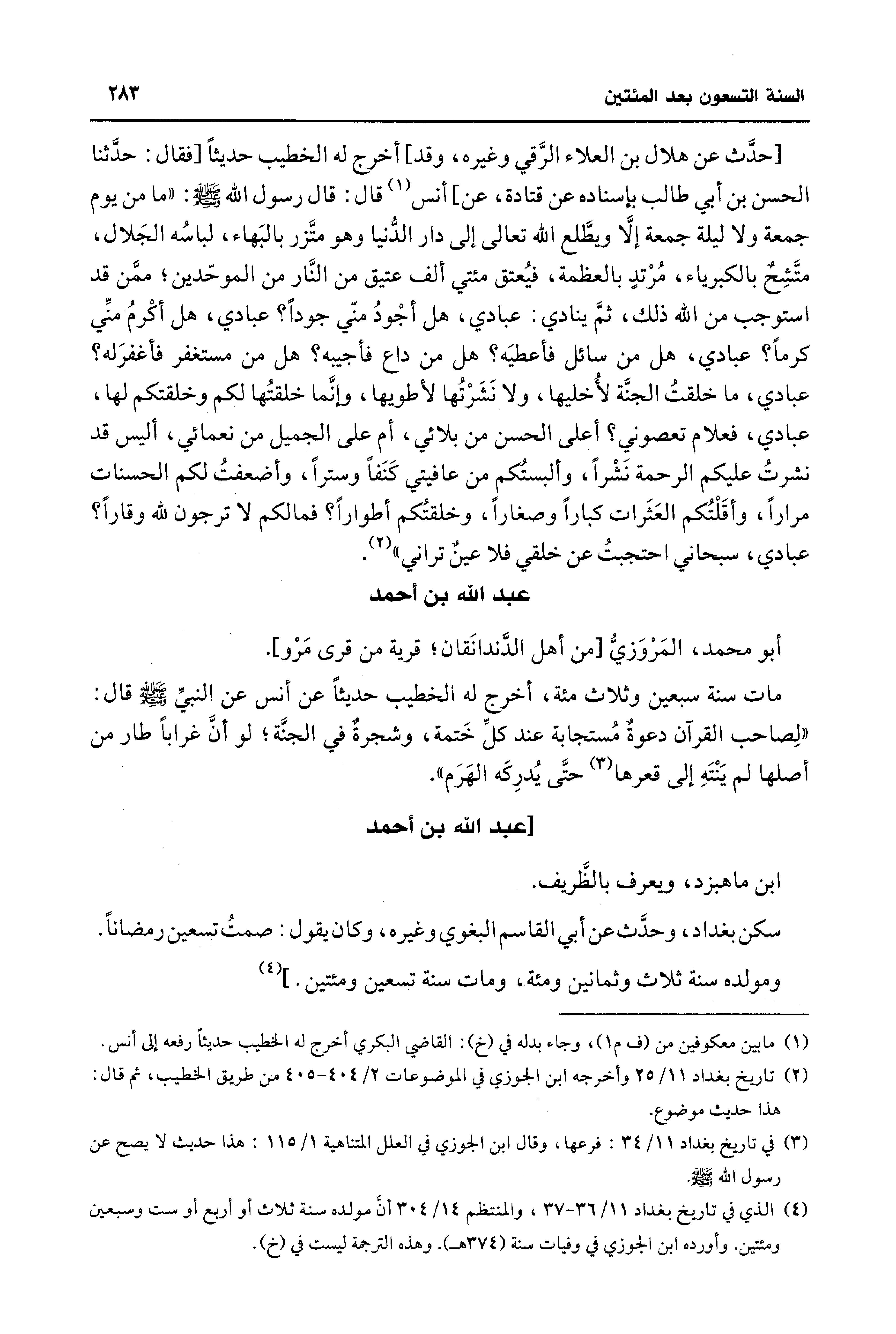 (¬4) الذي في تاريخ بغداد 11/ 36 - 37، والمنتظم 14/ 304 أنَّ مولده سنة ثلاث أو أربع أو ست وسبعين ومئتين. وأورده ابن الجوزي في وفيات سنة (374 هـ). وهذه الترجمة ليست في (خ).