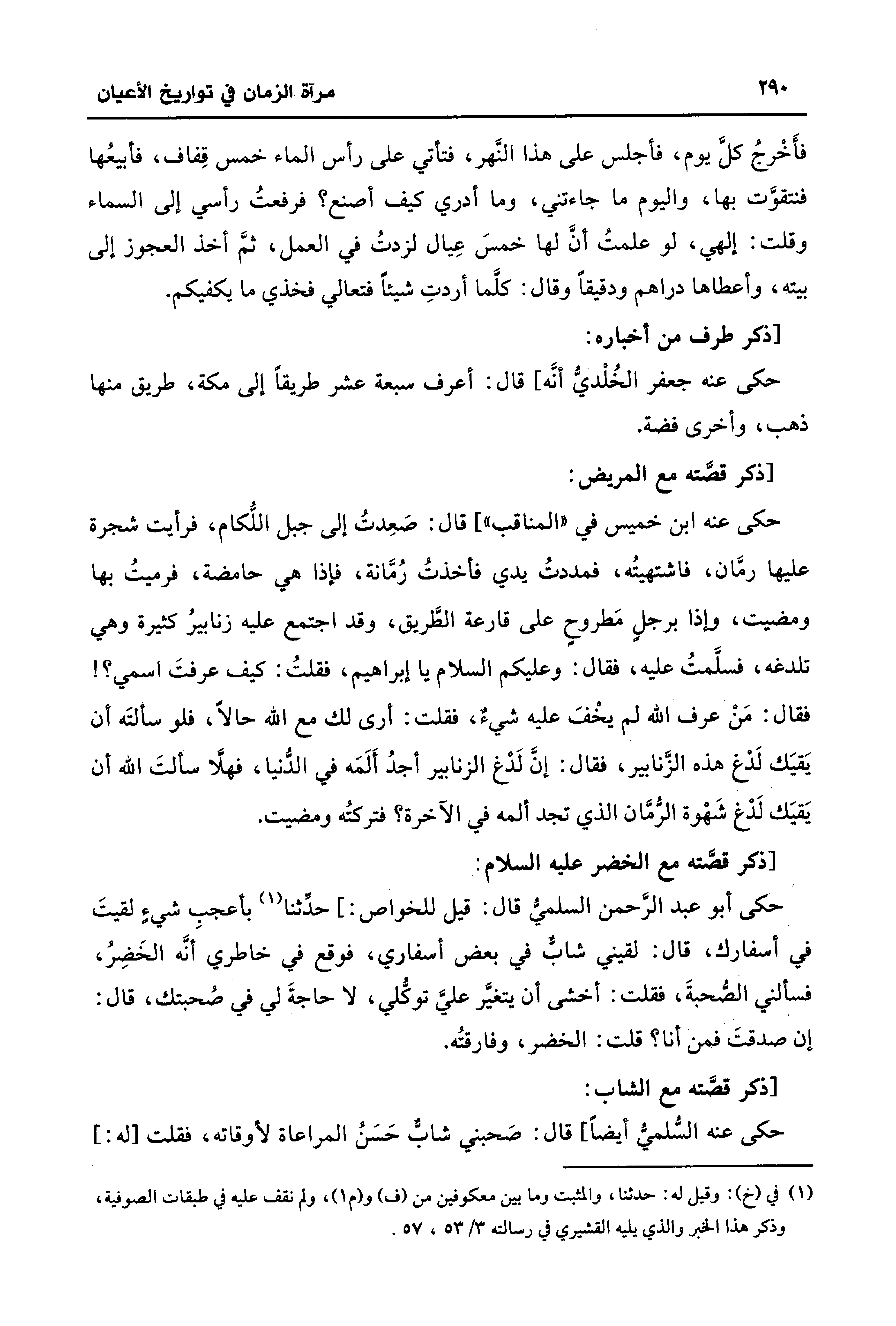 حكى أبو عبد الرَّحمن السلميُّ قال: قيل للخواص: ] حدِّثنا (¬1) بأعجبِ شيءٍ لقيتَ في أسفارك، قال: لقيني شابٌّ في بعض أسفاري، فوقع في خاطري أنَّه الخَضِرُ، فسألني الصُّحبةَ، فقلت: أخشى أن يتغيَّر عليَّ توكُّلي، لا حاجةَ لي في صُحبتك، قال: إن صدقتَ فمن أنا؟ قلت: الخضر، وفارقتُه.