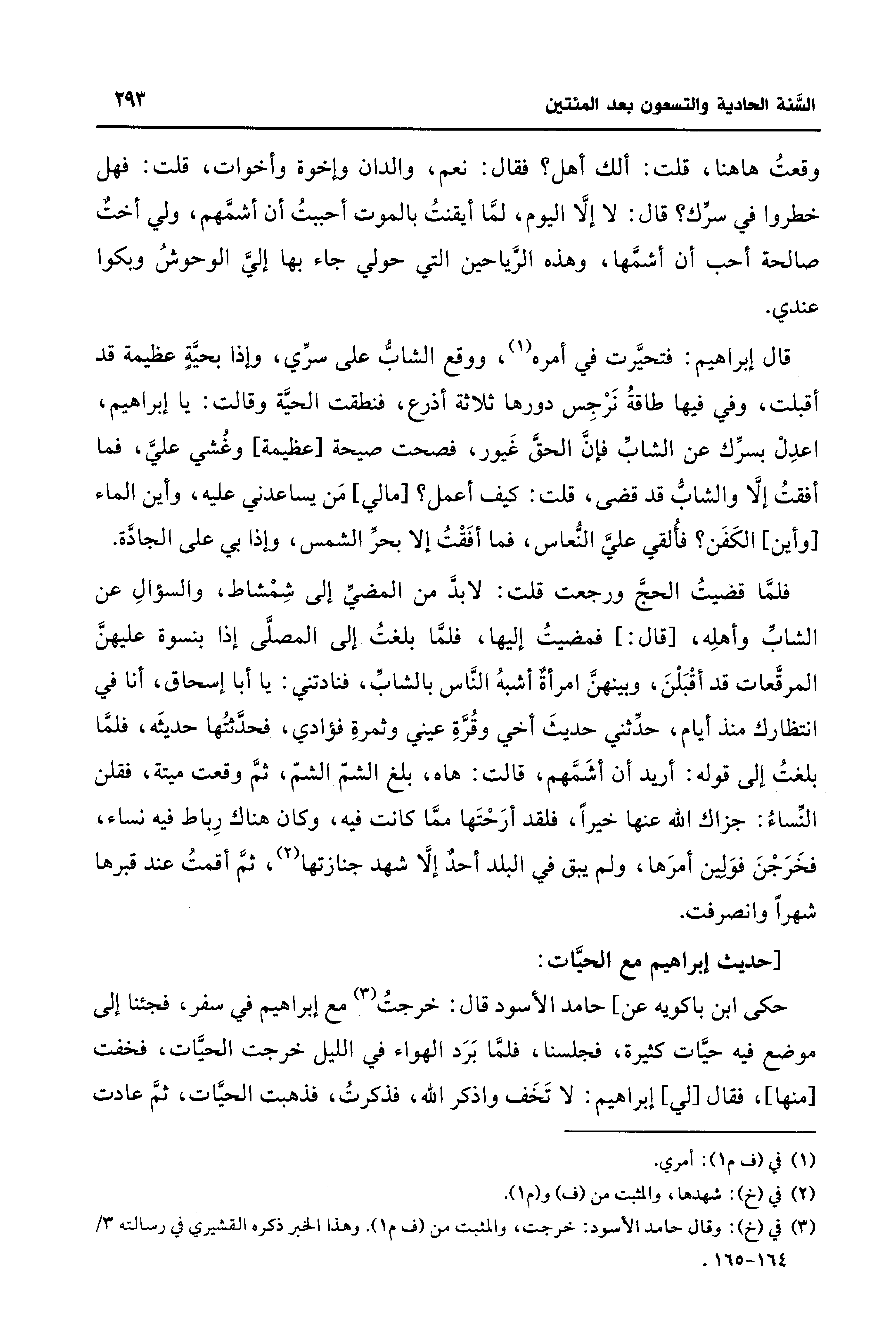 حكى ابن باكويه عن] حامد الأسود قال: خرجتُ (¬3) مع إبراهيم في سفر، فجئنا إلى موضع فيه حيَّات كثيرة، فجلسنا، فلمَّا بَرَد الهواء في الليل خرجت الحيَّات، فخفت [منها]، فقال [لي] إبراهيم: لا تَخَف واذكر الله، فذكرتُ، فذهبت الحيَّات، ثمَّ عادت