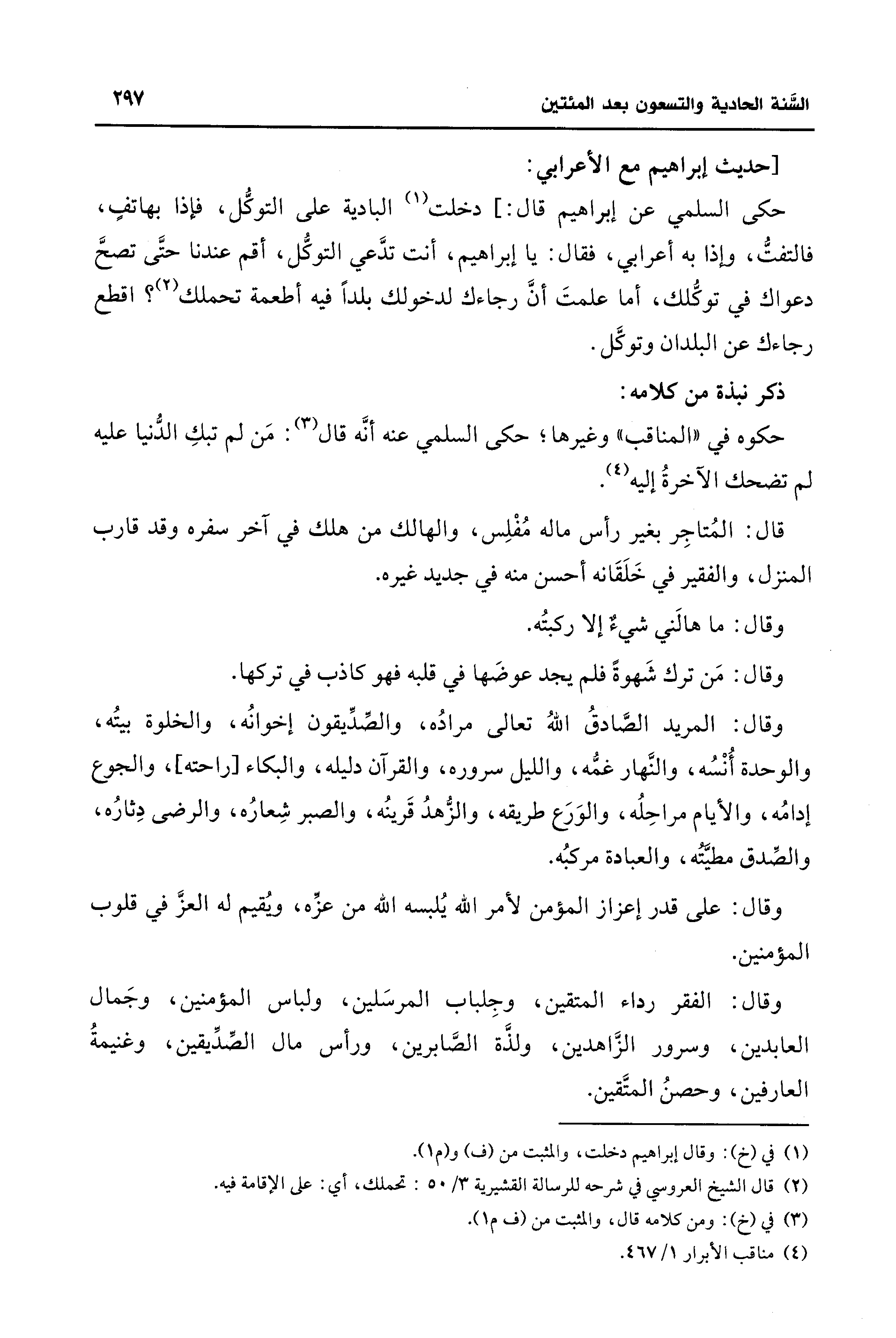 حكى السلمي عن إبراهيم قال: ] دخلت (¬1) البادية على التوكُّل، فإذا بهاتفٍ، فالتفتُّ، وإذا به أعرابي، فقال: يَا إبراهيم، أَنْتَ تدَّعي التوكّل، أقم عندنا حتَّى تصحَّ دعواك في توكُّلك، أما علمتَ أنَّ رجاءك لدخولك بلدًا فيه أطعمة تحملك (¬2)؟ اقطع رجاءك عن البلدان وتوكَّل.
