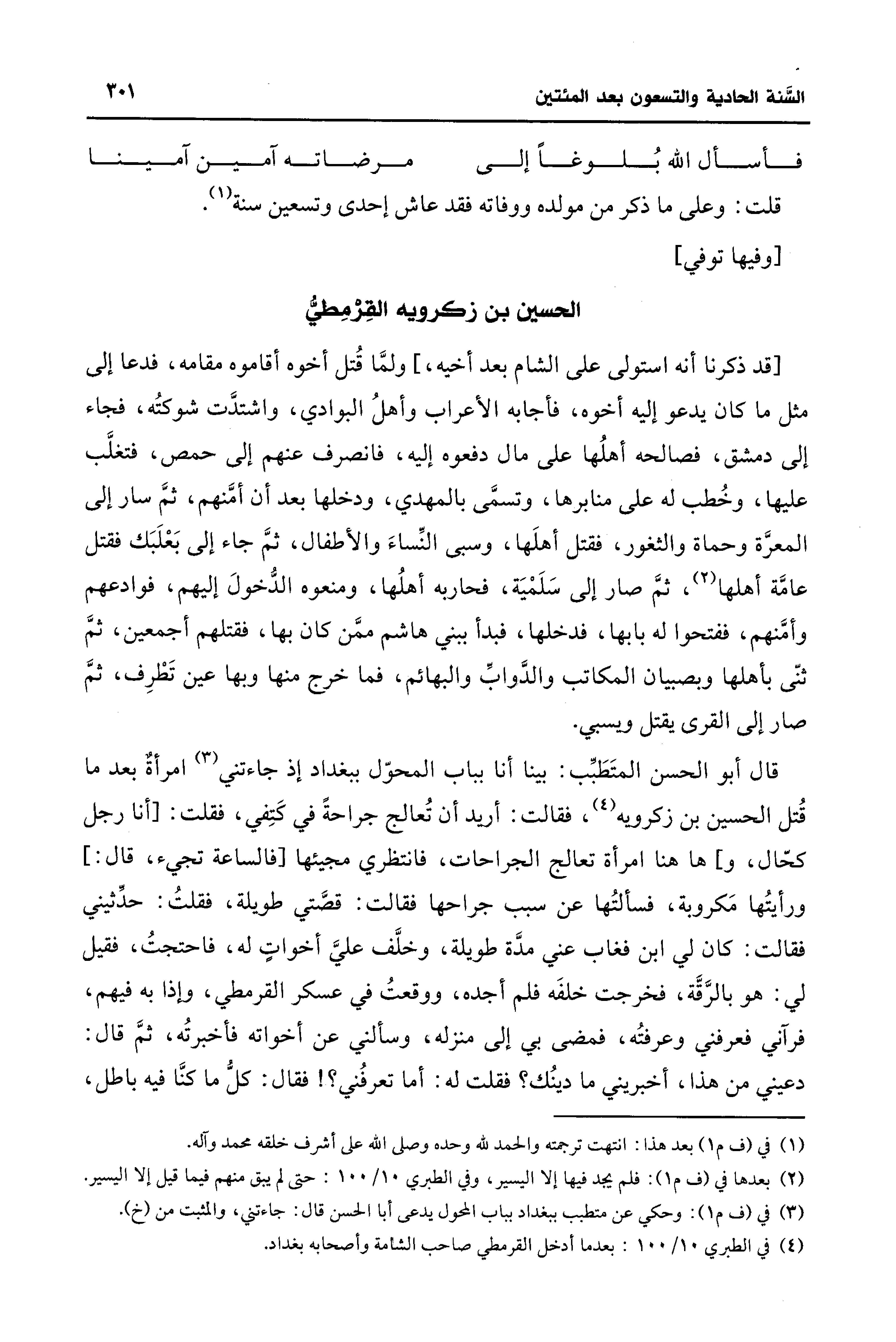 قال أبو الحسن المتَطَبِّب: بينا أنا بباب المحوّل ببغداد إذ جاءتني (¬3) امرأةٌ بعد ما قُتل الحسين بن زكرويه (¬4)، فقالت: أريد أن تُعالج جراحةً في كَتِفي، فقلت: [أنا رجل كحّال، و] ها هنا امرأة تعالج الجراحات، فانتظري مجيئها [فالساعة تجيء، قال: ] ورأيتُها مَكروبة، فسألتُها عن سبب جراحها فقالت: قصَّتي طويلة، فقلتُ: حدّثيني فقالت: كان لي ابن فغاب عني مدَّة طويلة، وخلَّف عليَّ أخواتٍ له، فاحتجتُ، فقيل لي: هو بالرَّقَّة، فخرجت خلفَه فلم أجده، ووقعتُ في عسكر القرمطي، وإذا به فيهم، فرآني فعرفني وعرفتُه، فمضى بي إلى منزله، وسألني عن أخواته فأخبرتُه، ثمَّ قال: دعيني من هذا، أخبريني ما دينُك؟ فقلت له: أما تعرفُني؟ ! فقال: كلُّ ما كنَّا فيه باطل،