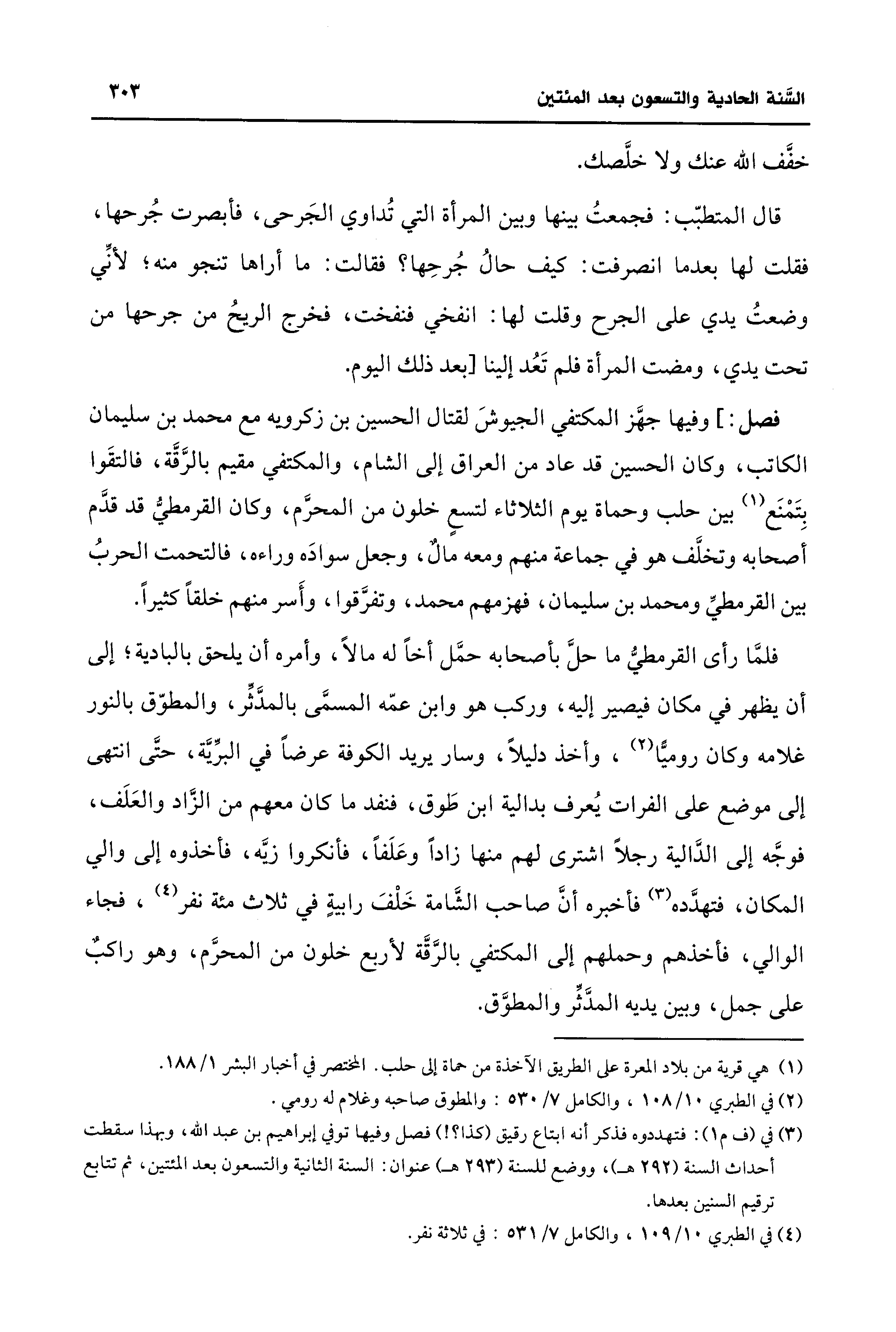 (¬3) في (ف م 1): فتهددوه فذكر أنَّه ابتاع رقيق (كذا؟ ! ) فصل وفيها تُوفِّي إبراهيم بن عبد الله، وبهذا سقطت أحداث السنة (292 هـ)، ووضع للسنة (293 هـ) عنوان: السنة الثَّانية والتسعون بعد المئتين، ثم تتابع ترقيم السنين بعدها.