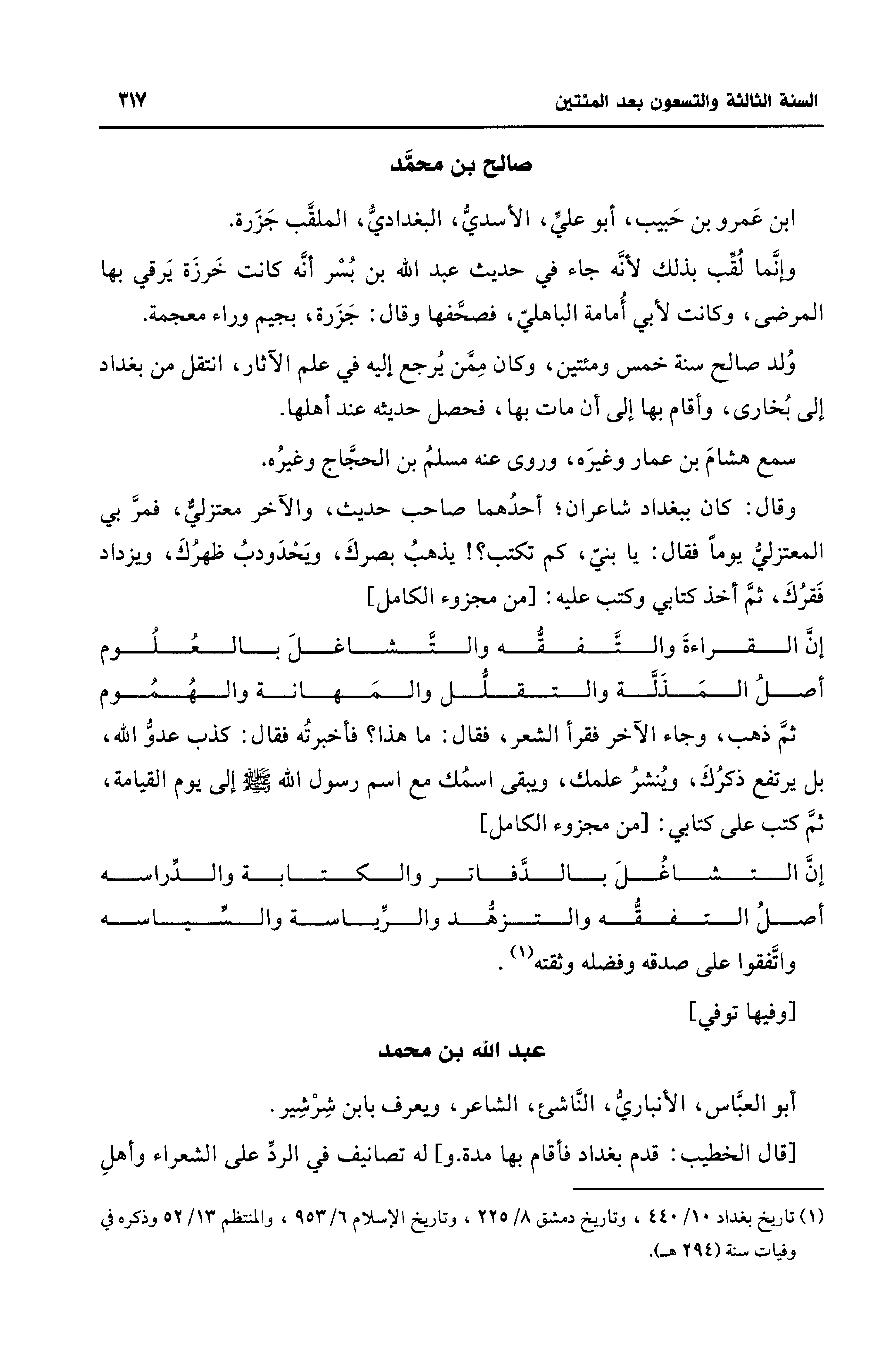 (¬1) تاريخ بغداد 10/ 440، وتاريخ دمشق 8/ 225، وتاريخ الإِسلام 6/ 953، والمنتظم 13/ 52 وذكره في وفيات سنة (294 هـ).