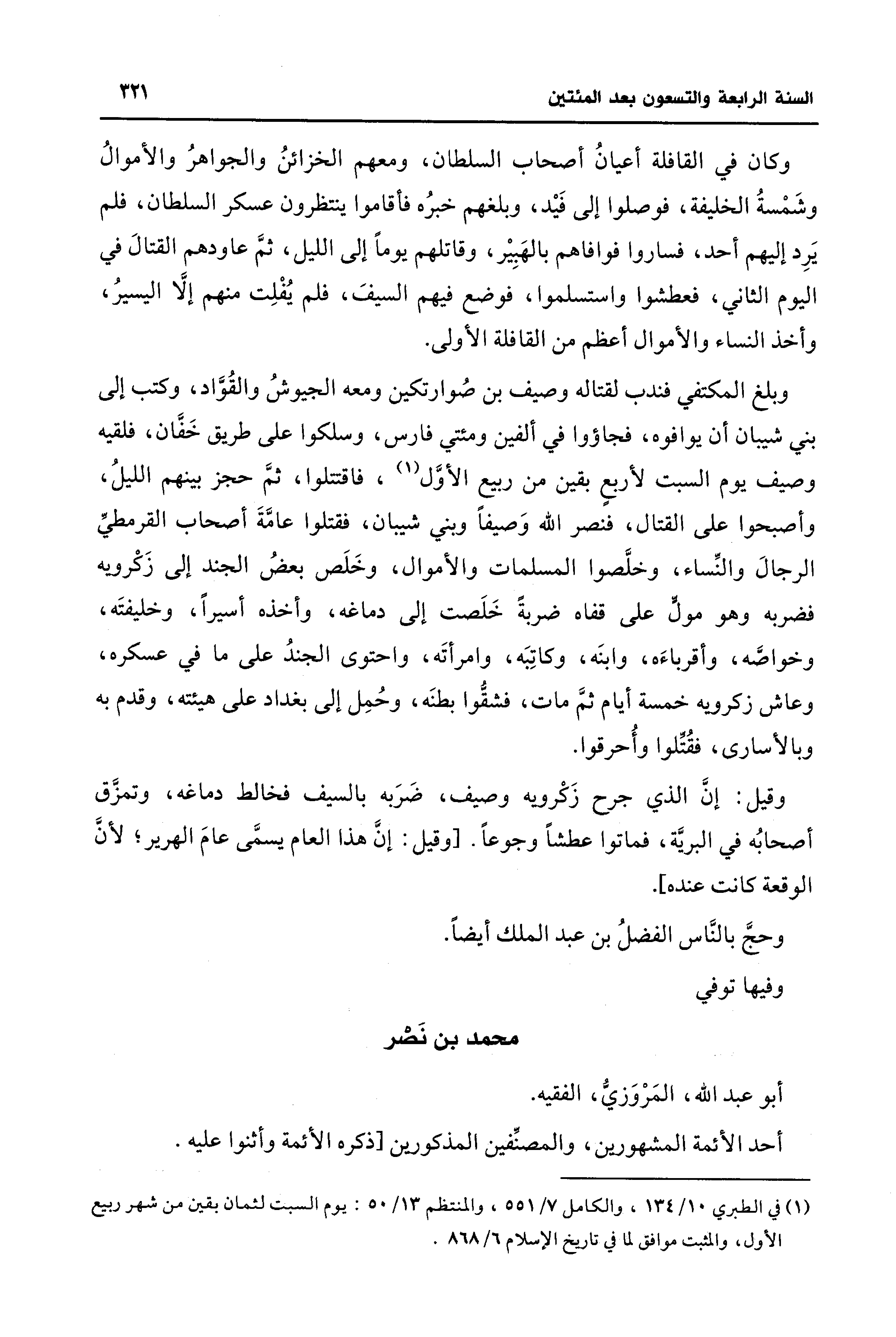 وقيل: إنَّ الذي جرح زَكْرويه وصيف، ضَرَبه بالسيف فخالط دماغه، وتمزَّق أصحابُه في البريَّة، فماتوا عطشًا وجوعًا. [وقيل: إنَّ هذا العام يسمَّى عامَ الهرير؛ لأنَّ الوقعة كانت عنده].