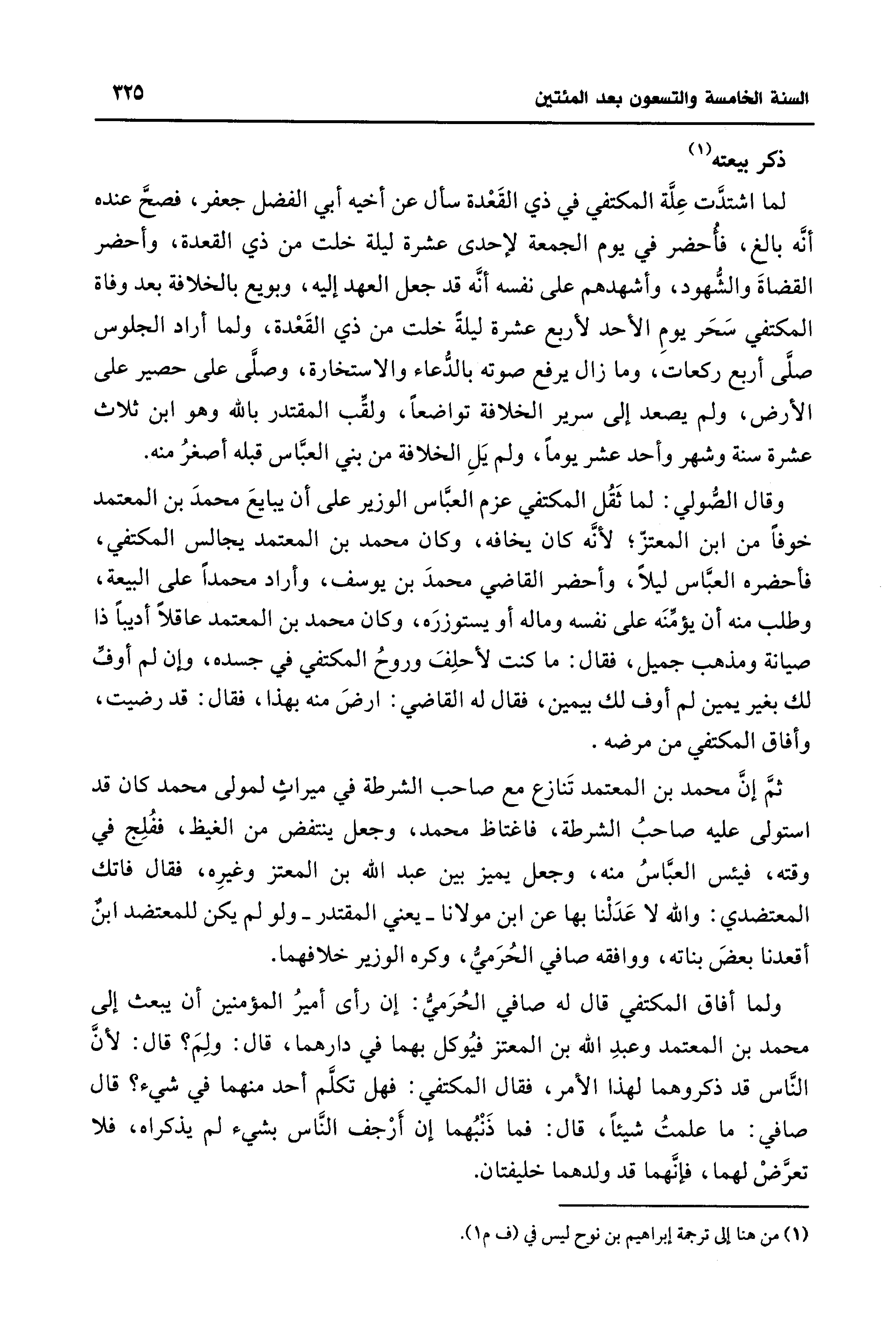 وقال الصُّولي: لما ثَقُل المكتفي عزم العبَّاس الوزير على أن يبايعَ محمدَ بن المعتمد خوفًا من ابن المعتزّ؛ لأنَّه كان يخافه، وكان محمد بن المعتمد يجالس المكتفي، فأحضره العبَّاس ليلًا، وأحضر القاضي محمدَ بن يوسف، وأراد محمدًا على البيعة، وطلب منه أن يؤمِّنَه على نفسه وماله أو يستوزرَه، وكان محمد بن المعتمد عاقلًا أديبًا ذا صيانة ومذهب جميل، فقال: ما كنت لأحلِفَ وروحُ المكتفي في جسده، وإن لم أوفِّ لك بغير يمين لم أوف لك بيمين، فقال له القاضي: ارضَ منه بهذا، فقال: قد رضيت، وأفاق المكتفي من مرضه.