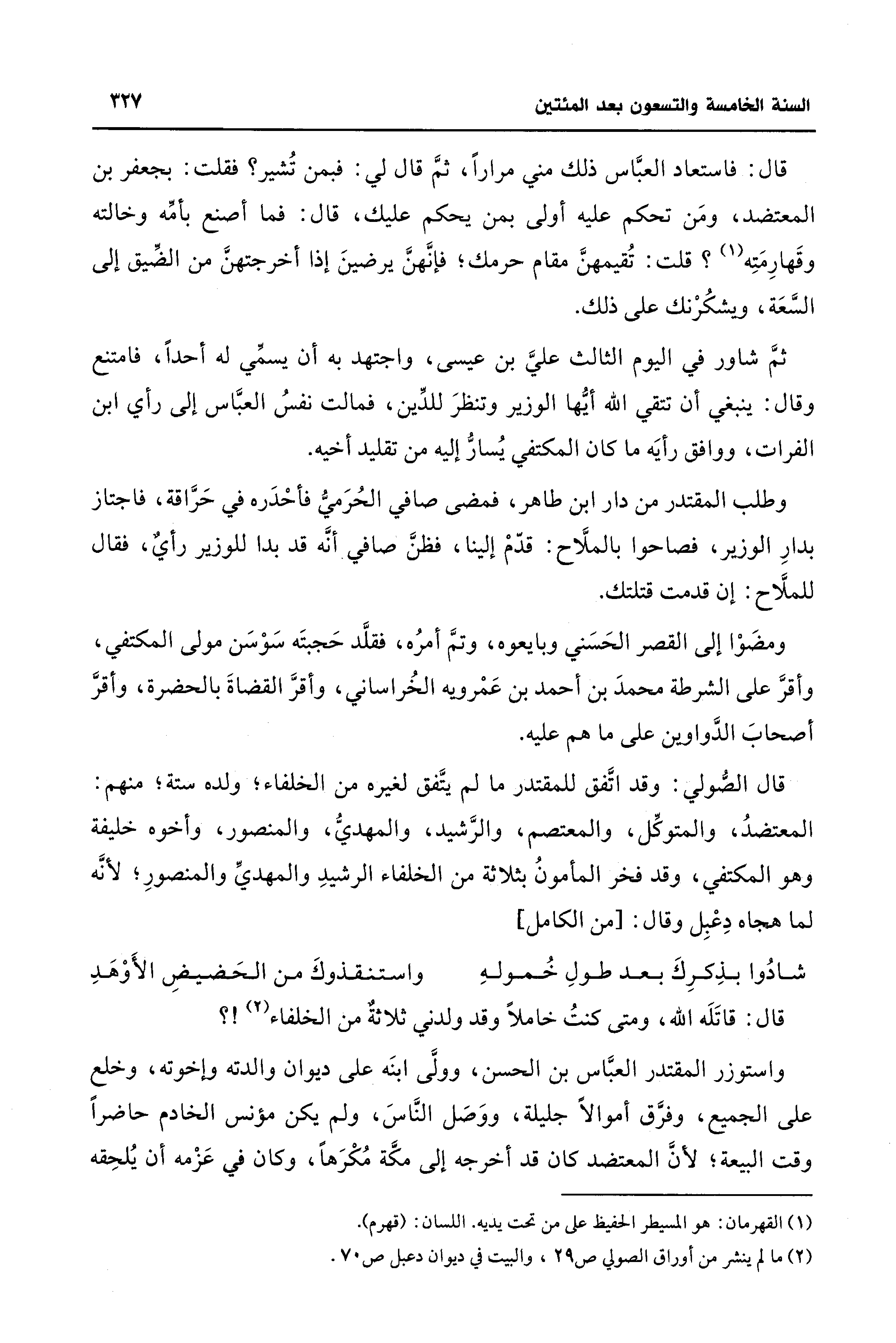قال: فاستعاد العبَّاس ذلك مني مرارًا، ثمَّ قال لي: فبمن تُشير؟ فقلت: بجعفر بن المعتضد، ومَن تحكم عليه أولى بمن يحكم عليك، قال: فما أصنع بأمِّه وخالته وقَهارِمَتِه (¬1)؟ قلت: تُقيمهنَّ مقام حرمك؛ فإنَّهنَّ يرضينَ إذا أخرجتهنَّ من الضِّيق إلى السَّعَة، ويشكُرْنك على ذلك.