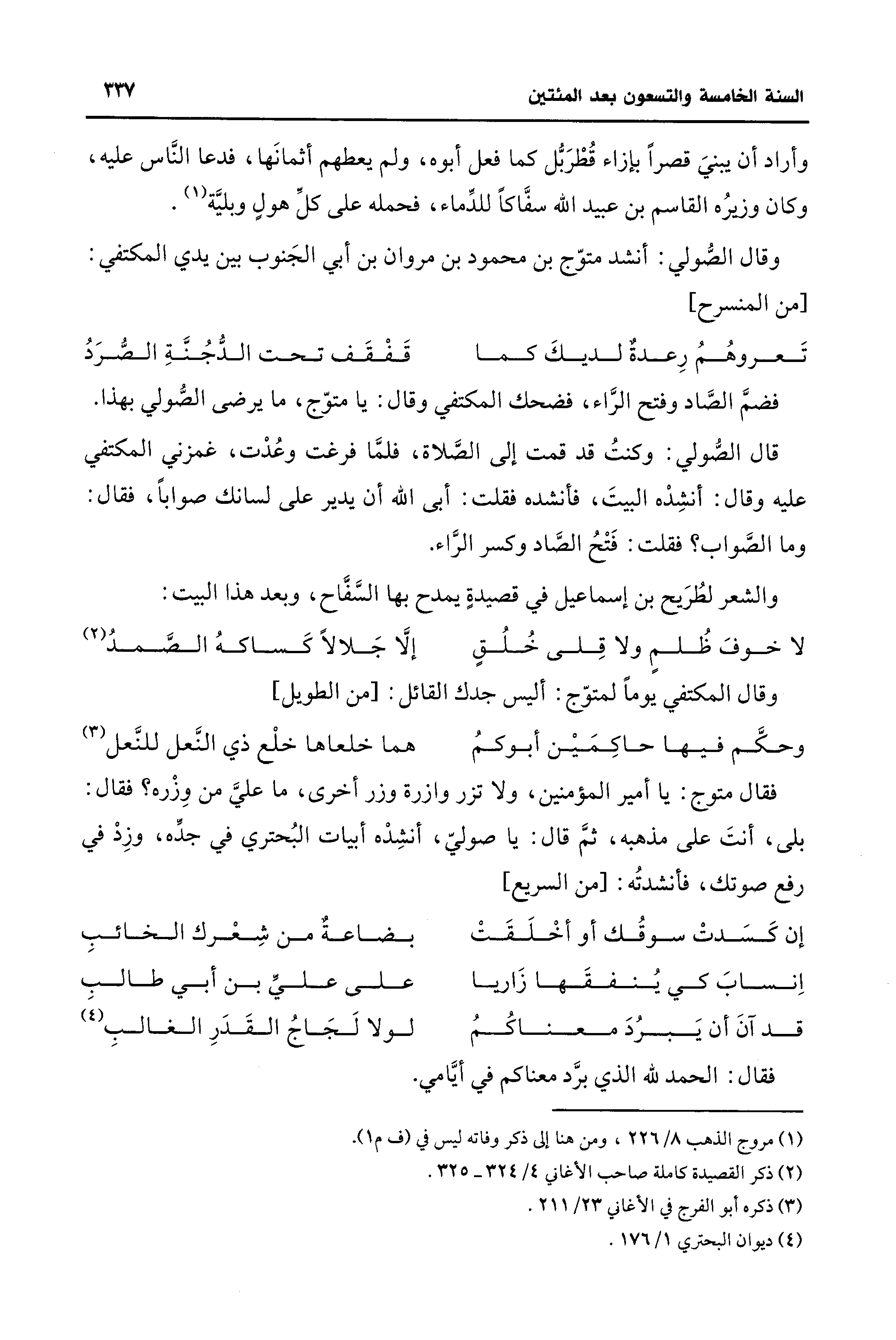 فقال متوج: يا أمير المؤمنين، ولا تزر وازرة وزر أخرى، ما عليَّ من وزْره؟ فقال: بلى، أنتَ على مذهبه، ثمَّ قال: يا صوليّ، أنشِدْه أبيات البُحتري في جدِّه، وزِدْ في رفع صوتك، فأنشدتُه: [من السريع]