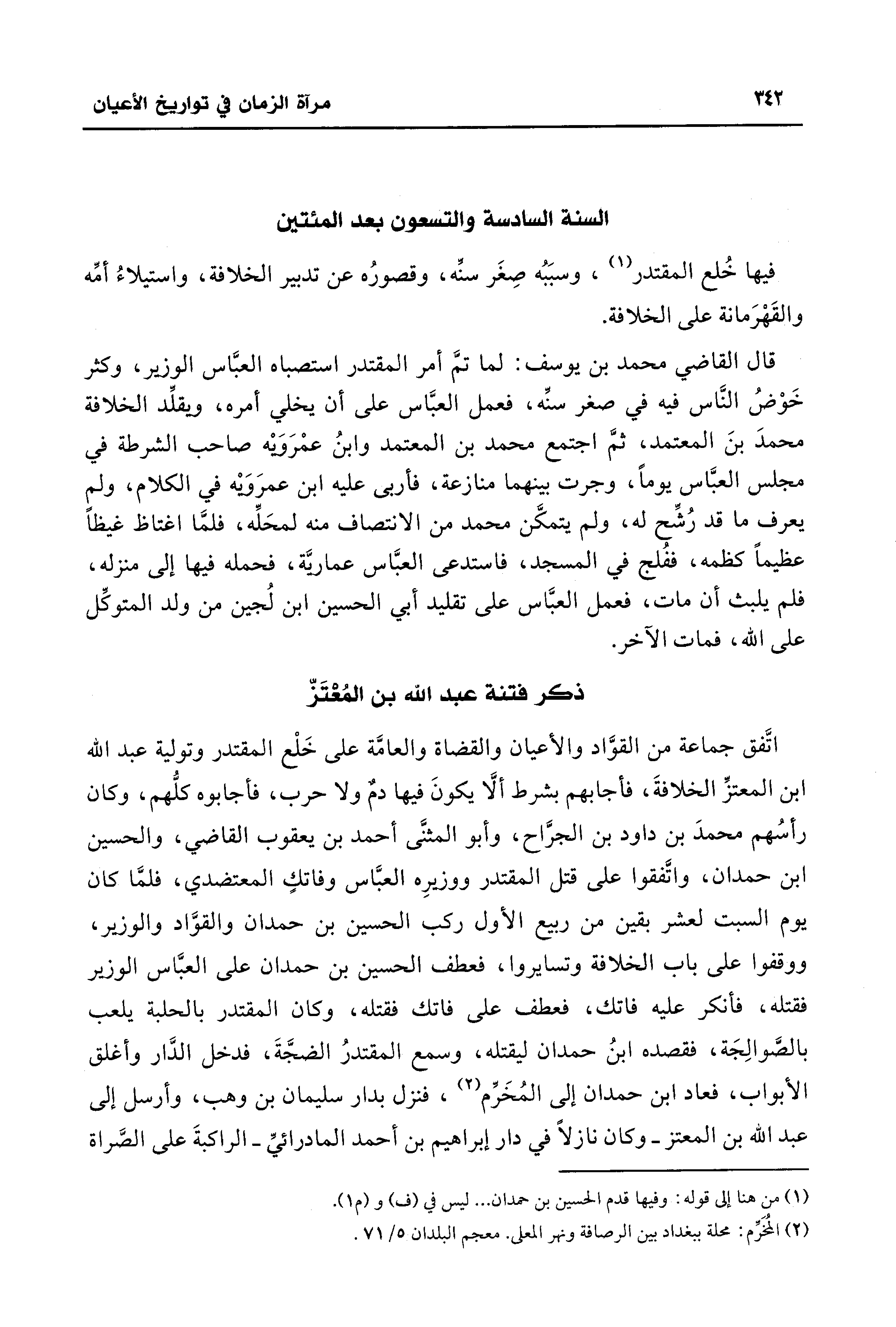 اتَّفق جماعة من القوَّاد والأعيان والقضاة والعامَّة على خَلْع المقتدر وتولية عبد الله بن المعتزِّ الخلافةَ، فأجابهم بشرط ألا يكونَ فيها دمٌ ولا حرب، فأجابوه كلُّهم، وكان رأسُهم محمدَ بن داود بن الجرَّاح، وأبو المثنَّى أحمد بن يعقوب القاضي، والحسين بن حمدان، واتَّفقوا على قتل المقتدر ووزيرِه العبَّاس وفاتكٍ المعتضدي، فلمَّا كان يوم السبت لعشر بقين من ربيع الأول ركب الحسين بن حمدان والقوَّاد والوزير، ووقفوا على باب الخلافة وتسايروا، فعطف الحسين بن حمدان على العبَّاس الوزير فقتله، فأنكر عليه فاتك، فعطف على فاتك فقتله، وكان المقتدر بالحلبة يلعب بالصَّوالِجَة، فقصده ابنُ حمدان ليقتله، وسمع المقتدرُ الضجَّةَ، فدخل الدَّار وأغلق الأبواب، فعاد ابن حمدان إلى المُخَرِّم (¬2)، فنزل بدار سليمان بن وهب، وأرسل إلى عبد الله بن المعتز -وكان نازلًا في دار إبراهيم بن أحمد المادرائيِّ- الراكبةَ على الصَّراة