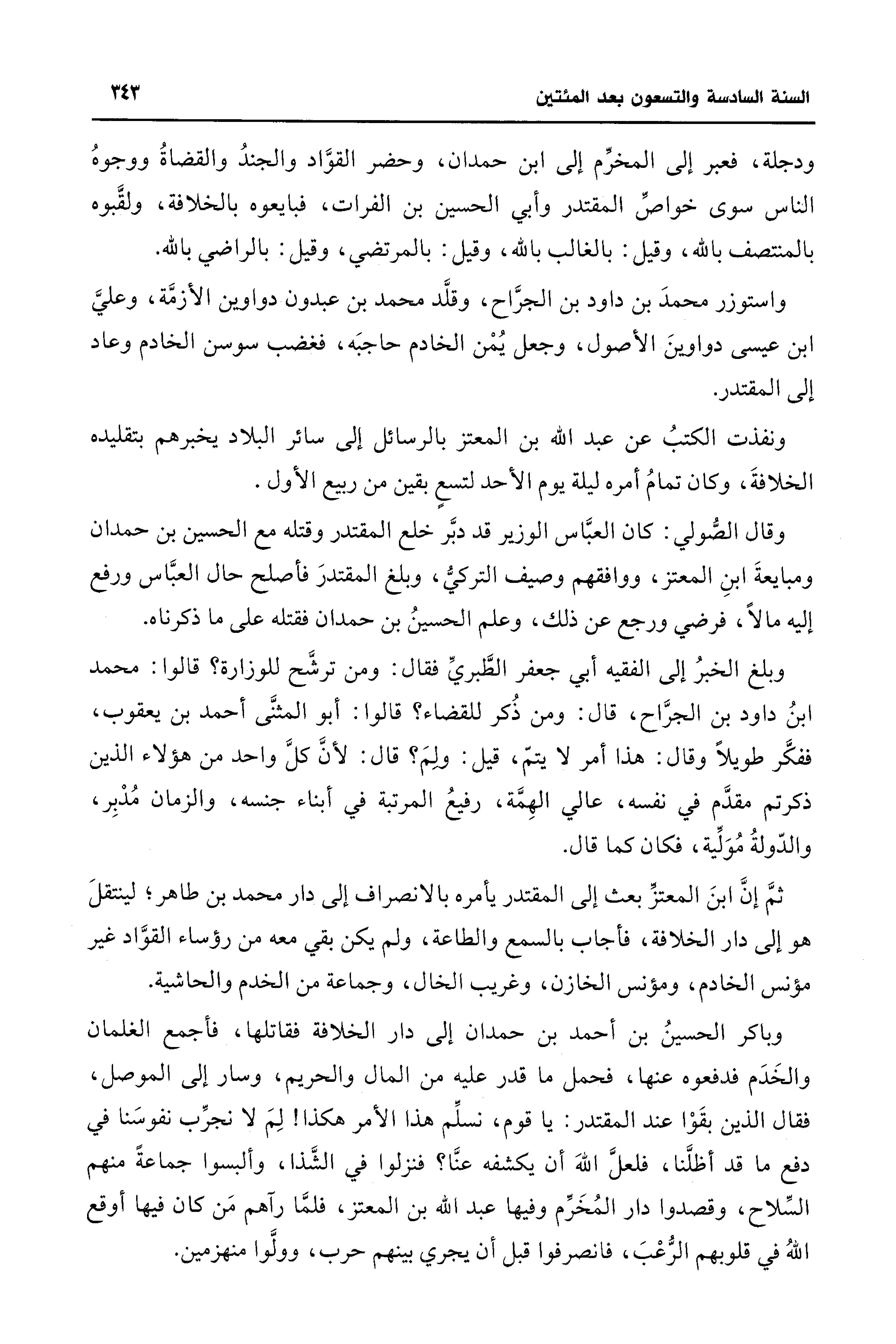 وباكر الحسينُ بن أحمد بن حمدان إلى دار الخلافة فقاتلها، فأجمع الغلمان والخَدَم فدفعوه عنها، فحمل ما قدر عليه من المال والحريم، وسار إلى الموصل، فقال الذين بقَوْا عند المقتدر: يا قوم، نسلِّم هذا الأمر هكذا! لِمَ لا نجرِّب نفوسَنا في دفع ما قد أظلَّنا، فلعلَّ اللهَ أن يكشفه عنَّا؟ فنزلوا في الشَّذا، وألبسوا جماعةً منهم السِّلاح، وقصدوا دار المُخَرِّم وفيها عبد الله بن المعتز، فلمَّا رآهم مَن كان فيها أوقع اللهُ في قلوبهم الرُّعْبَ، فانصرفوا قبل أن يجري بينهم حرب، وولَّوا منهزمين.