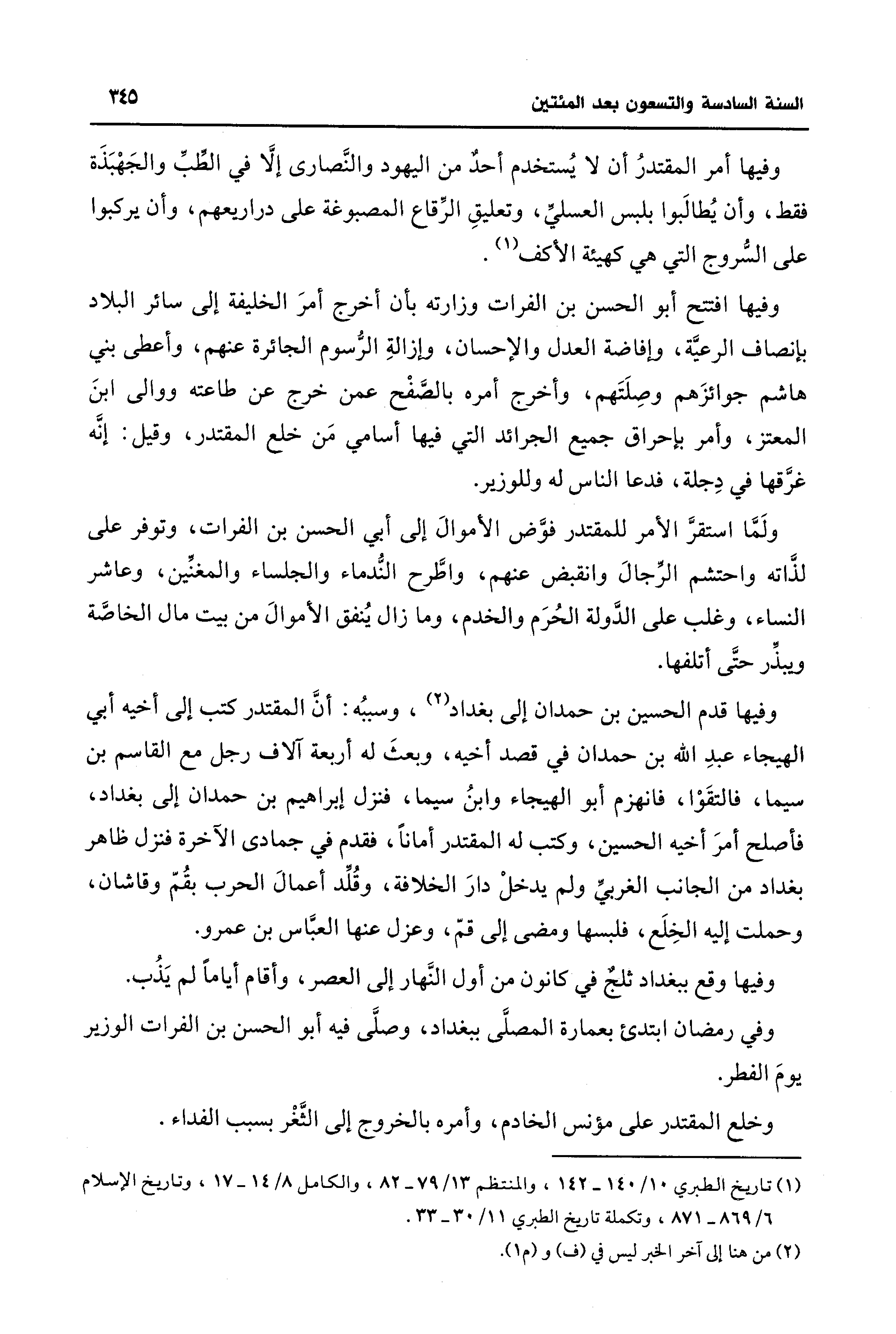 (¬1) تاريخ الطبري 10/ 140 - 142، والمنتظم 13/ 79 - 82، والكامل 8/ 14 - 17، وتاريخ الإسلام 6/ 869 - 871، وتكملة تاريخ الطبري 11/ 30 - 33.