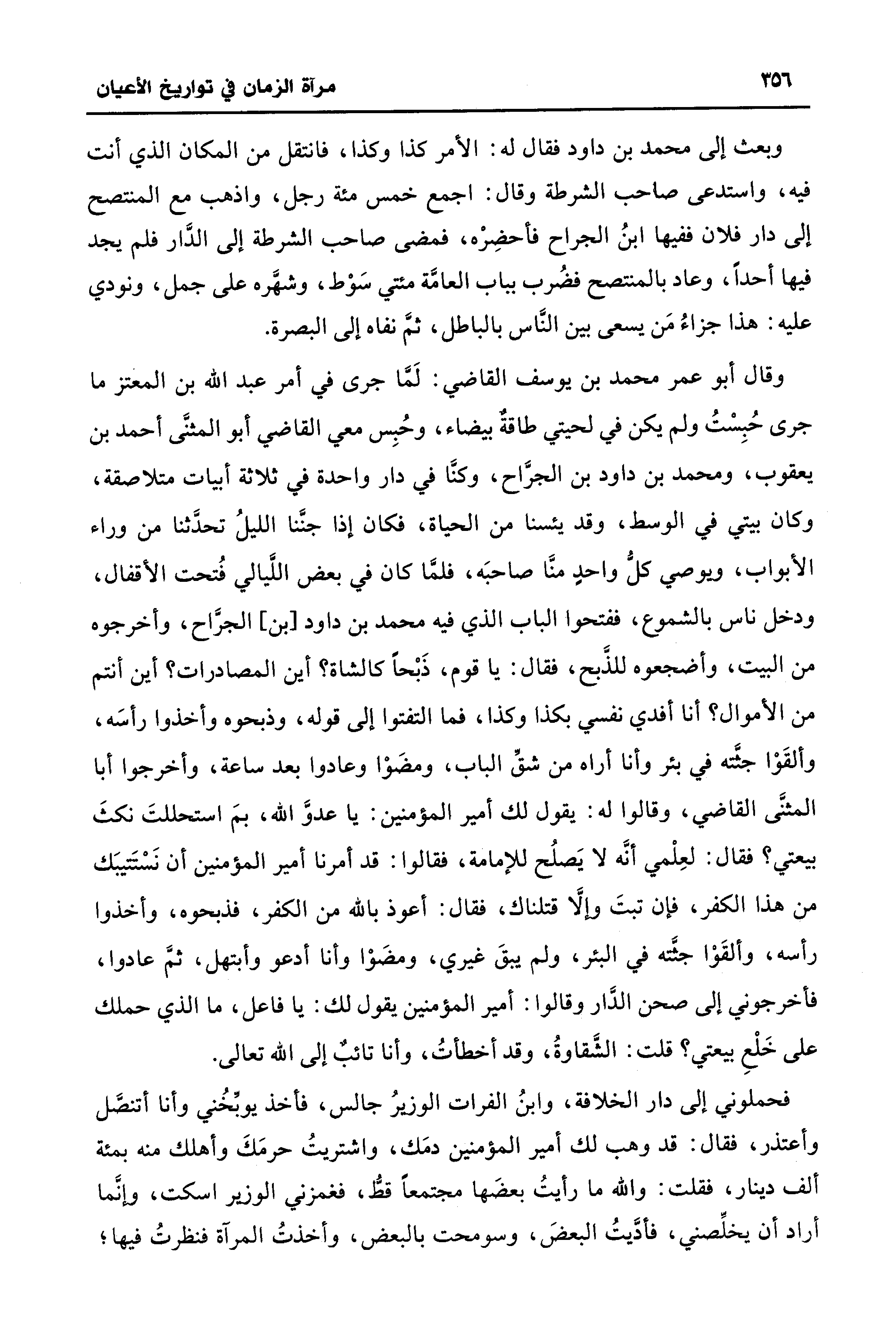 وقال أبو عمر محمد بن يوسف القاضي: لَمَّا جرى في أمر عبد الله بن المعتز ما جرى حُبِسْتُ ولم يكن في لحيتي طاقة بيضاء، وحُبِس معي القاضي أبو المثنَّى أحمد بن يعقوب، ومحمد بن داود بن الجرَّاح، وكنَّا في دار واحدة في ثلاثة أبيات متلاصقة، وكان بيتي في الوسط، وقد يئسنا من الحياة، فكان إذا جنَّنا الليلُ تحدَّثنا من وراء الأبواب، ويوصي كلُّ واحدٍ منَّا صاحبَه، فلمَّا كان في بعض اللَّيالي فُتحت الأقفال، ودخل ناس بالشموع، ففتحوا الباب الذي فيه محمد بن داود [بن] الجرَّاح، وأخرجوه من البيت، وأضجعوه للذَّبح، فقال: يا قوم، ذَبْحًا كالشاة؟ أين المصادرات؟ أين أنتم من الأموال؟ أنا أفدي نفسي بكذا وكذا، فما التفتوا إلى قوله، وذبحوه وأخذوا رأسَه، وألقَوْا جثَّته في بئر وأنا أراه من شقِّ الباب، ومضَوْا وعادوا بعد ساعة، وأخرجوا أبا المثنَّى القاضي، وقالوا له: يقول لك أمير المؤمنين: يا عدوَّ الله، بمَ استحللتَ نكثَ بيعتي؟ فقال: لعِلْمي أنَّه لا يَصلُح للإمامة، فقالوا: قد أمرنا أمير المؤمنين أن نَسْتَتيبَك من هذا الكفر، فإن تبتَ وإلا قتلناك، فقال: أعوذ بالله من الكفر، فذبحوه، وأخذوا رأسه، وألقَوْا جثَّته في البئر، ولم يبقَ غيري، ومضَوْا وأنا أدعو وأبتهل، ثمَّ عادوا، فأخرجوني إلى صحن الدَّار وقالوا: أمير المؤمنين يقول لك: يا فاعل، ما الذي حملك على خَلْعِ بيعتي؟ قلت: الشَّقاوةُ، وقد أخطأتُ، وأنا تائبٌ إلى الله تعالى.